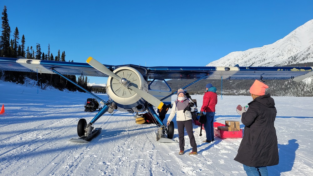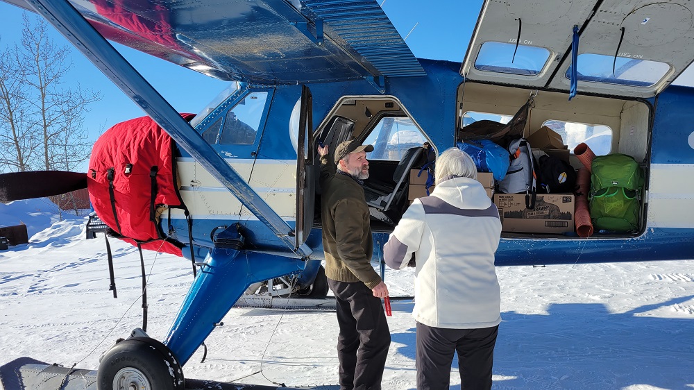 The landing was one of many outstanding firsts on this trip. Our approach toward Iniakuk Lake was followed by a 180-degree banked turn to land facing south, on the frozen lake. The “runway” was a man-made, snow machine packed, mostly level, area on the lake, about ½ mile from the lodge. The owner of the lodge, John, and his dog musher/handler/trainer, Thom, were there to greet us. They came on two snow machines. One was a bigger size and pulled two plastic sleds to carry the supplies and luggage. Dirk, the pilot, unloaded the plane, said adieu and before you knew it, he was off again leaving us in a flurry of snow.