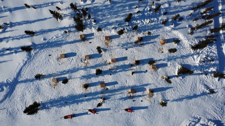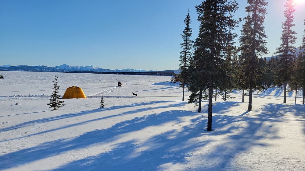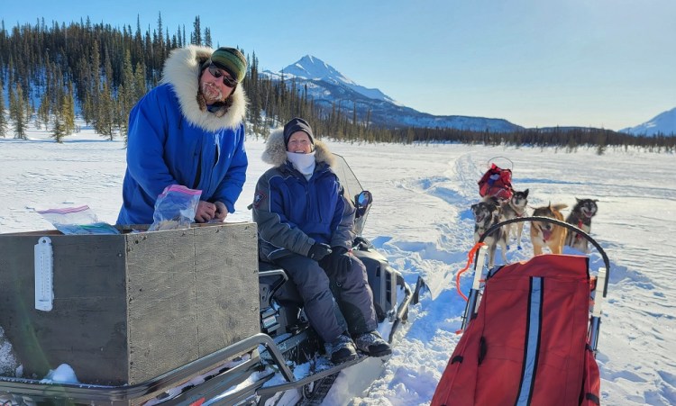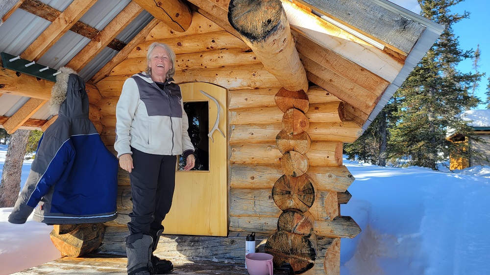 Craig and Sherry followed Thom to the dog yard for an early afternoon mush. Gary headed up the deep snow shoeing trail he started making yesterday to a nearby knoll. I am by the fire writing this journal and will soon head to a sauna house John is warming for us. Wood is being brought in by Sam, water thermoses are being filled, dishes done in two dish pans of boiled water from the wood stove and the bathroom portable toilet is emptied and cleaned to name a few of constant chores that are all done for us each day if not twice a day.