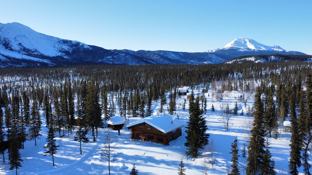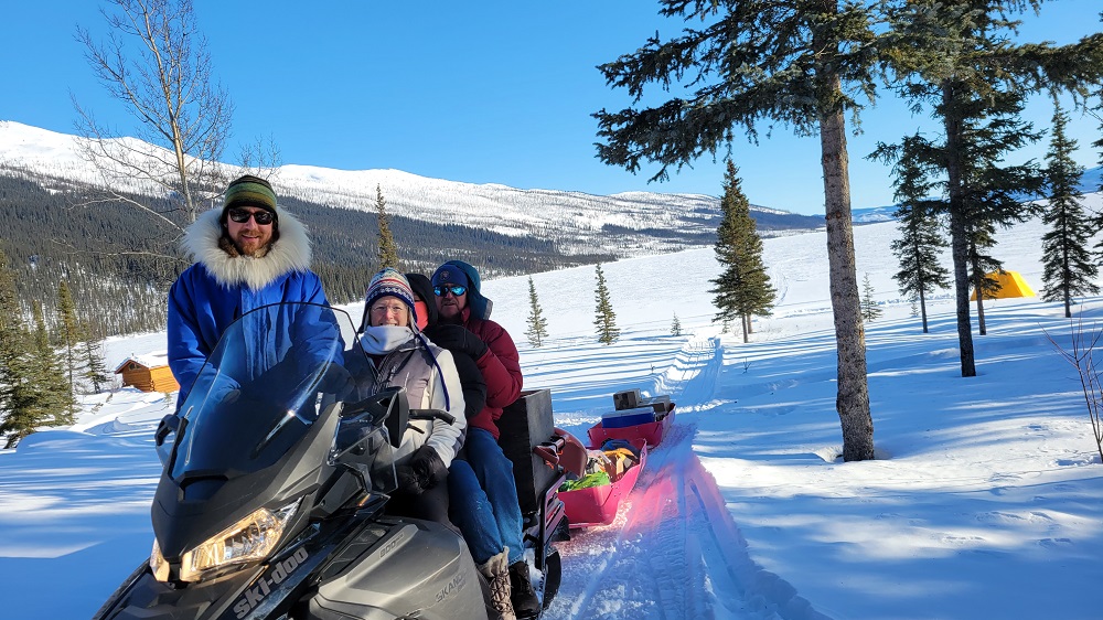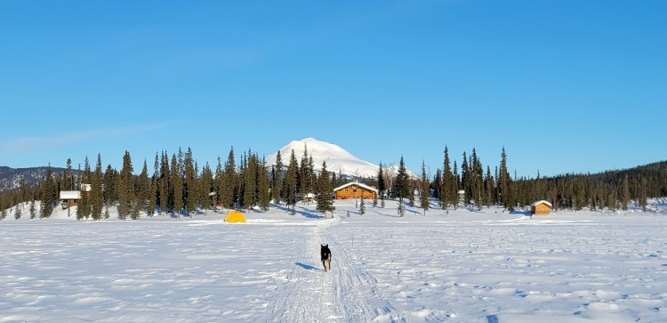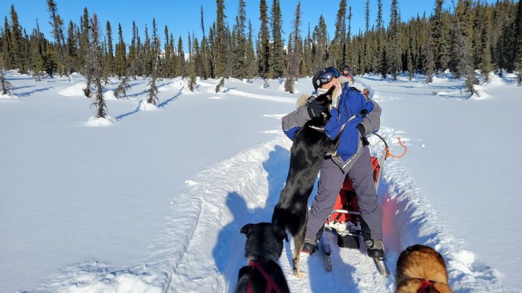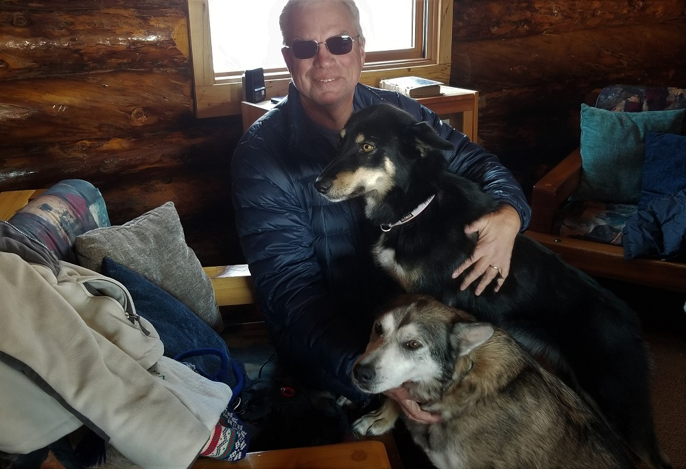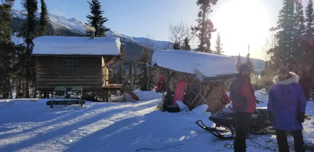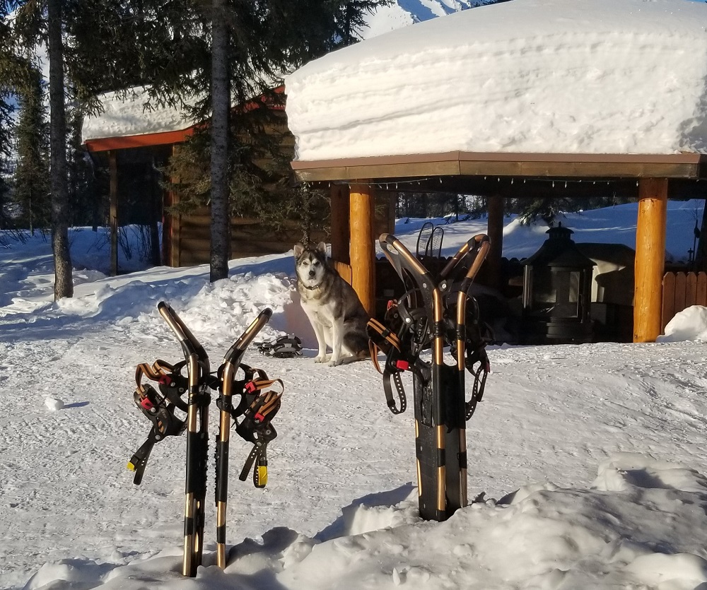 Gary hopped on one snow machine with Thom. Craig, Sherry and I rode John’s, pulling the loaded two large sleds, back to the lodge. Best and most memorable airport transfer ever! We were greeted by a retired sled dog named Phoenix! Neon the second retired dog welcomed us into the lodge.
