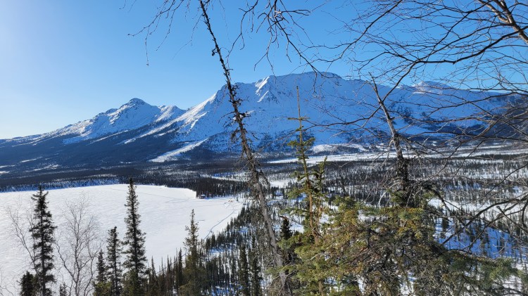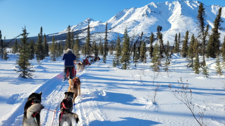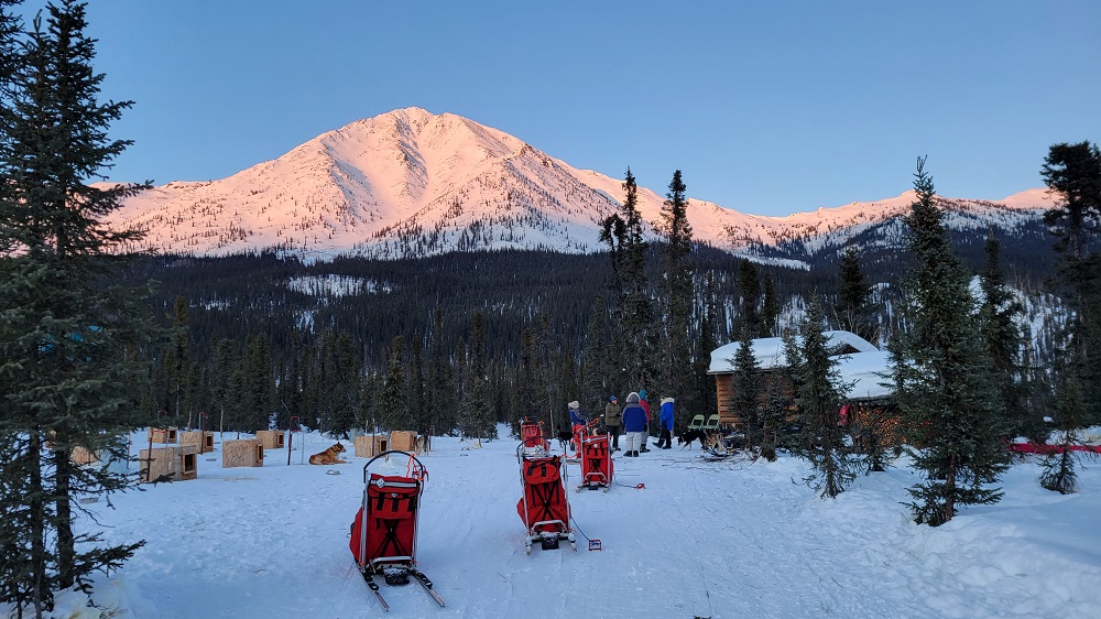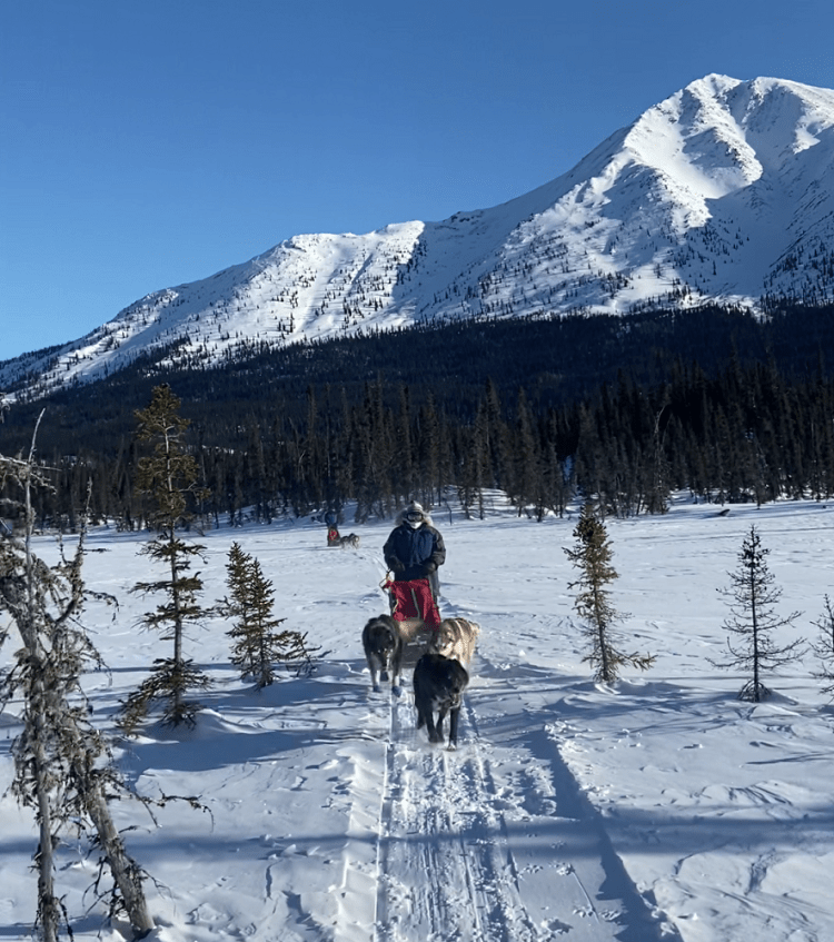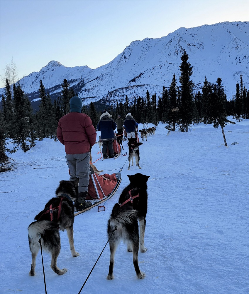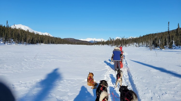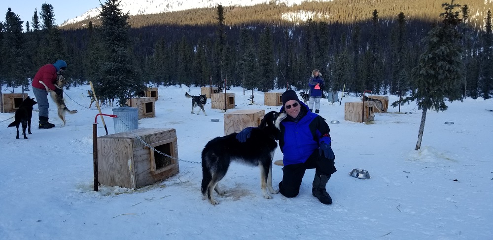 We hooked up three dogs appointed to us by Thom, following all his directions of the many steps it takes to ready them all for mushing. We headed out on a fabulous 6-mile loop. We navigated some small hills, assisted the team by single leg pushing through some soft snow and trying to stay upright around curves. We challenged our memory of dog commands like “alright” to go forward, “Gee” for right, “Haw” for left and “Ho” said long and drawn out to prep them to slow down and finally come to a stop. Although the temps were as cold as I have ever experienced, even while growing up in Vermont, the Alaskan saying that there are no cold days, only cold clothing is sooo true. We got hot and sweaty! Okay, my face got a bit numb at times when there was skin showing between my hat and goggles or when my neck gator slid down off my face and exposed my nose. But the magnificent mountain views, untouched snow sparkling in the sun, blue skies and realizing you are mushing dogs all by yourself in the Alaskan wilderness, quickly made you smile and forget all about the minor spots of cold.