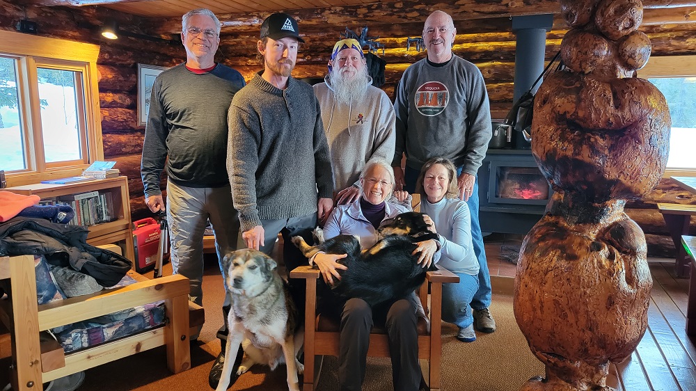The four of us hunkered down by the wood stove after breakfast. John went out to groom sled dog trails we will ride on one last time before leaving tomorrow AM, Tom went to care for the dogs and Sam prepped for lunch. It’s warmed up to 3 degrees above zero…the warmest day since we arrived. Lunch was a kale, sausage and veggie soup with homemade bread. Yum!