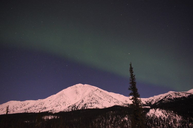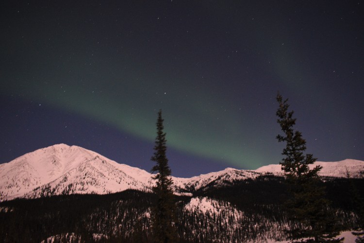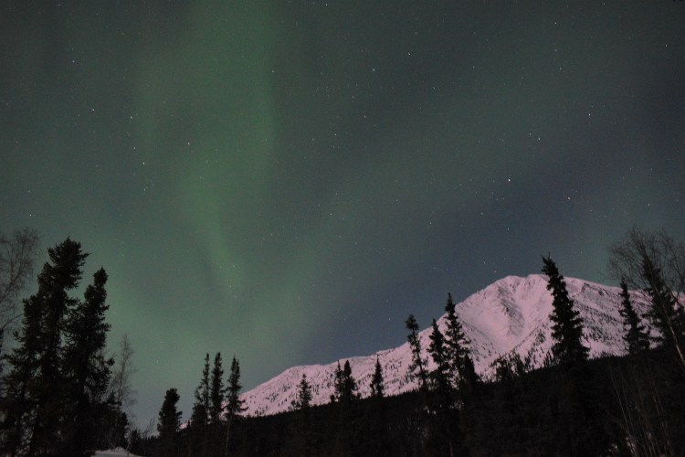 After seeing the Aurora Borealis from the train last night, by the time we got to our hotel after midnight in Fairbanks, we wanted to bundle up and go outside to take a few pictures in the 10-degree weather. There’s an empty lot behind the Candlewood Hotel so Gary was able to eliminate some ambient light from parking lots and businesses to get the first pictures we have ever taken of the Northern Lights!