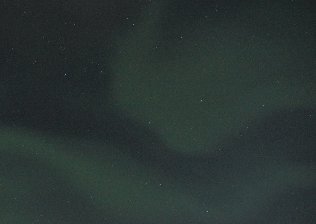 The view out the bathroom window looks north so every time Gary gets up in the night he brings his camera with him. Tonight about 1:15am there was a weak Aurora starting, so he woke up Elizabeth and we got dressed up and headed outside to see what was going on. John heard us and also came out. We decided it was worth waking up Sherry and Craig to view mother nature’s amazing show. The Aurora varies in intensity and location so Gary just kept taking pictures. After an hour we decided it was a “good” show. We were hesitant to go in for fear of missing a spectacular show if the Aurora intensified. We all went back to sleep, so we wouldn’t know if it did get any better.
