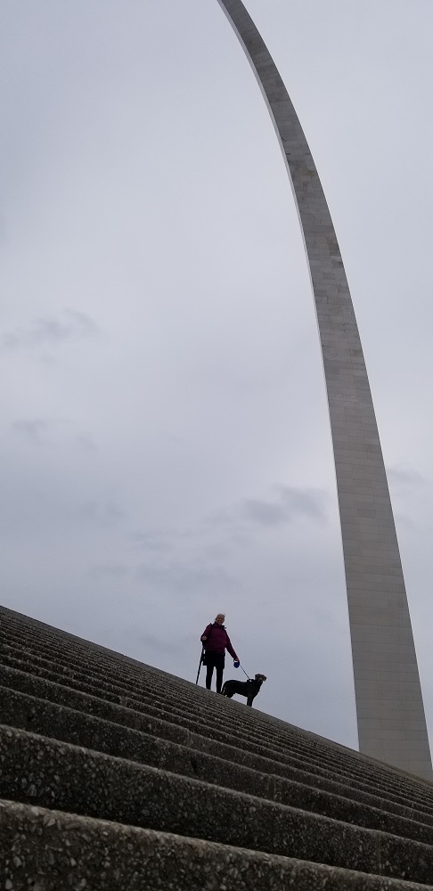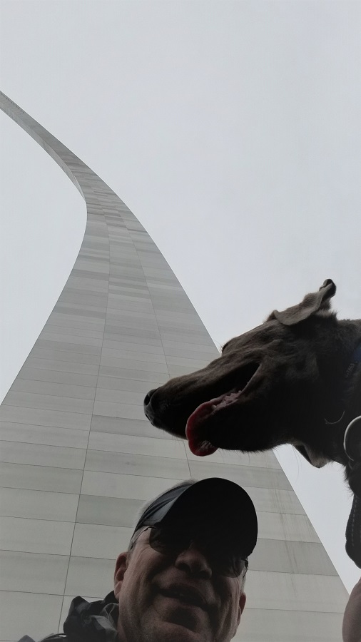 Being so close to the park has been great for Rangeley. There is plenty of grass for him to run around on (on leash) so we have been there six times this visit. After our walk in the city park, Elizabeth and Rangeley headed back to the hotel room. Today was rainy (starting at 10am) and 40 degrees, so not a great day to be outside. I headed back to the Park to ride the tram to the top of the arch. There are 8 small cabins that make up the tram. They say they can fit 5 people in each pod, but that would be extremely tight. Now they send up only groups that are together in a pod, so I had my own. The door to get in is about 18” wide and 4’ high. It takes 4 minutes to get up to the top, 630’ above the ground. The pods stay upright as you travel up the variable slope. Once on top I had my assigned 4 windows, 2 looking west and 2 looking east. We had 10 minutes on top and then it was 3 minutes down.