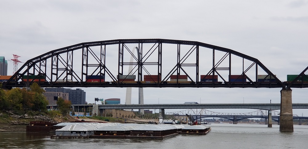 The river boat ride was narrated and we learned a lot about the history of the Mississippi on the shores of the arch. There is a train that runs over one of the many bridges between Illinois and Missouri. On that same bridge there used to be cars on historic Route 66. The highway has been removed from over the rail line. On another bridge there are cars with pedestrian space and below is a commuter train. There are huge barges that transport all sorts of products. The barges are arraigned in sets of 5 long and 3 deep, each single barge is 100+ feet long and 35 ft wide. The group of 15 barges are pushed down river by a large tug boat. This is the maximum size that will fit through the locks. The shores are lined with barges awaiting their turn to go through the 27 locks that enable the boats to ascend the 450 feet rise in water level between St Louis and Minneapolis/St Paul heading north. There are no locks between to St Louis and the Gulf of Mexico.