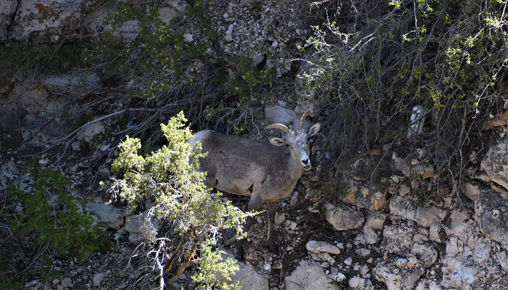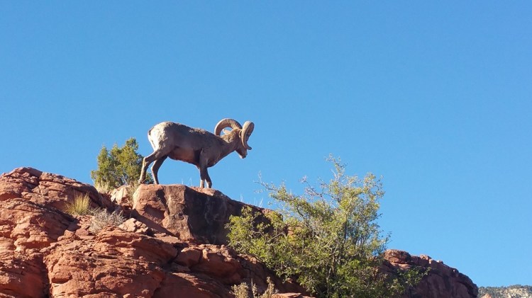 While walking along the rim by the El Tovar Hotel I spotted, what I thought was a deceased deer, about 100 yards down, on a ledge. I was so sad, surmising it had possibly fallen from above the night before. We walked on to visit a couple of gift shops for our traditional pin, postcard and ink stamp in our passport book trying not to feel so sad.