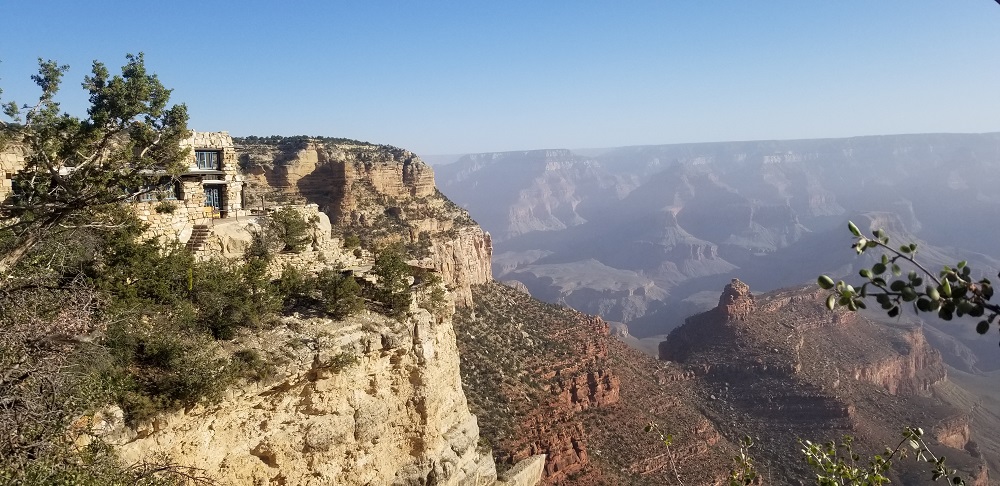 It’s now about 10AM. Gary and I realized our single chocolate croissant, milk and my coffee at 5:30 this morning was not holding us anymore. We drove back over to Yavapai Tavern, the only restaurant that allows dogs on their patio. The tavern was not opening until noon but we bought breakfast at the lodge’s other buffet restaurant and carried it outside. After breakfast we went to the main visitor center which is close to the Park Store and the General Store where I bought a Grand Canyon tee shirt for Gary. I often go into the stores during these trips with Rangeley. The “guys” stay in the car or walk around. I take pictures of the Tee shirts I like and Gary picks one out for me to buy. Team work!