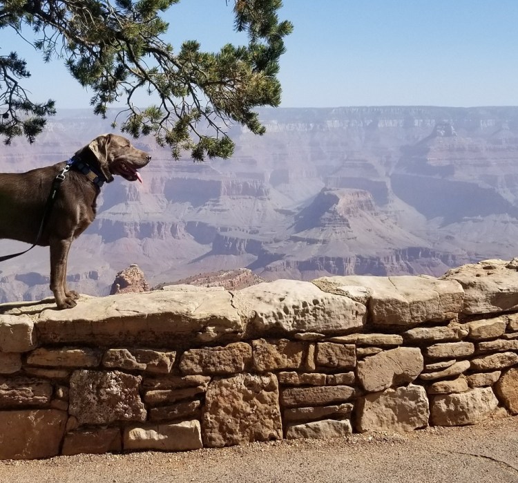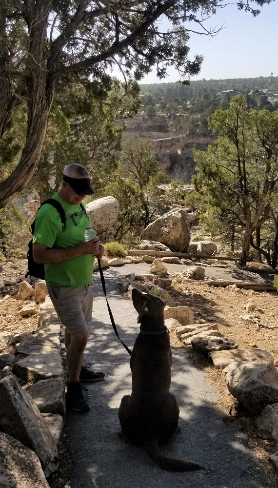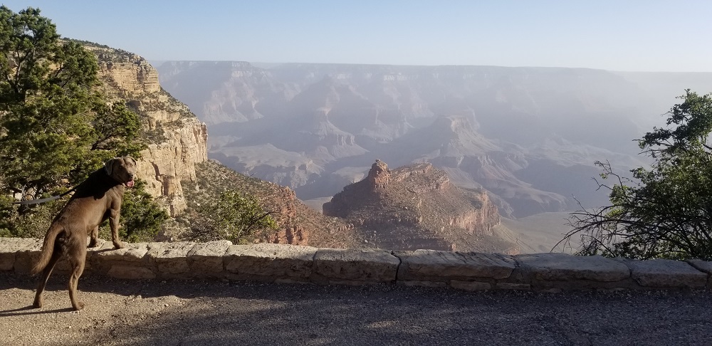 Rangeley is allowed anywhere at the top of the South Rim. Dogs are not permitted on dirt hiking trails and cannot go down into the Canyon. But we got a nice walk in on The Rim Trail. He was also happy at the Geological Museum last night and anywhere, outside, in Grand Canyon Village.