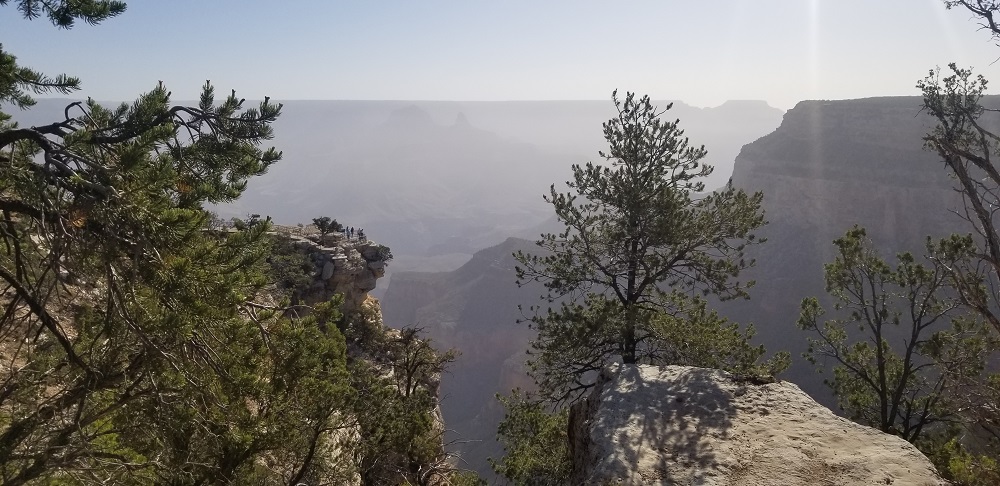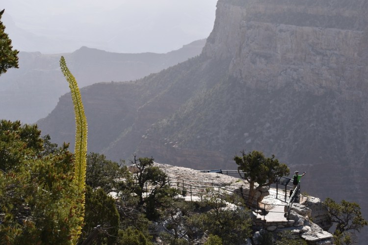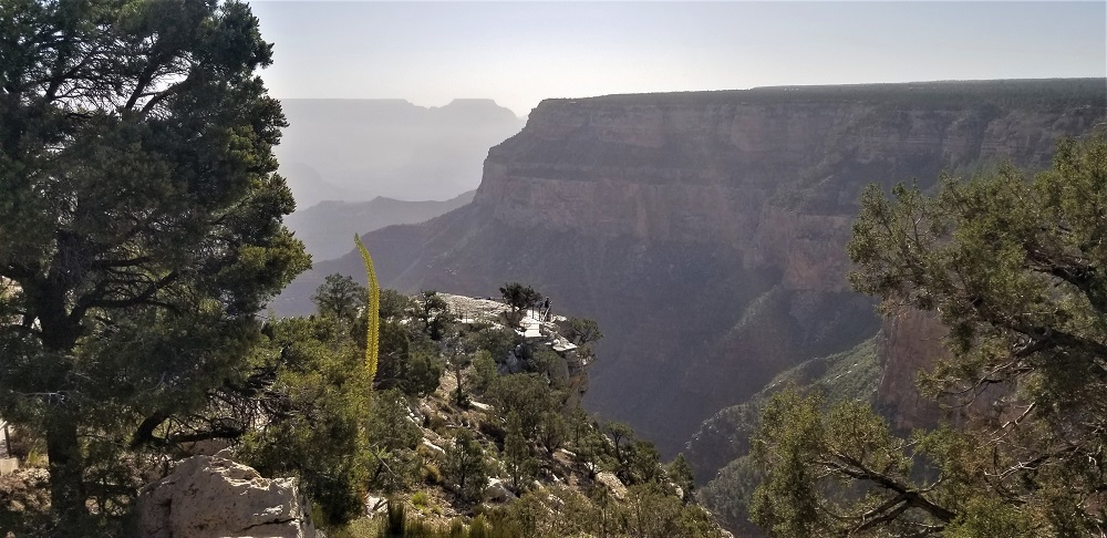 The drive from our home on the south east corner of Phoenix to the South Rim of the canyon is roughly 250 miles. You drive past good-ole western names like Bloody Basin and Big Bug Creek. There is cactus all around us in the Sonoran Desert where we live. The iconic Saguaro (pronounced saw- war- oh in Spanish and by everyone locally here) are present until you reach 4,000 feet in elevation where it becomes too cold for them to survive. Phoenix is at just under 1,100 ft. Not only does the weather get cooler heading north, the scenery and topography changes from the city, low desert and lots of cactus to the sprawling countryside full of low pines, prong horn (goat and antelope like hooved mammal) and cattle grazing in the plains of the high desert. The average rain fall in Phoenix is about 6-7 inches a year but we have only had less than ¾ of an inch since January! The South Rim of the Grand Canyon receives 17 inches of rain a year on average. You will notice the drought stricken, dry grass fields in the photos.