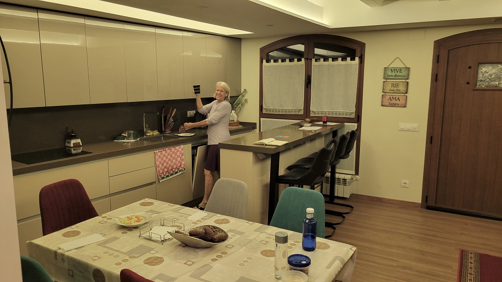 E: Cristina, owner of the Casa Rural Donde Cristina in Granon (pronounced Gran-yawn in Spanish, there’s a squiggly line over the first n and an accent mark after the o) brought over a huge bowl of cherries she just picked. She’s very sweet and appreciated us…and my slight OCD 😉 … I organized the game cabinet, straightened out the community book shelf, laid out her yesterday’s guest’s clean sheets and towels from the washer to dry (so I could wash our clothes too), emptied the previous guest’s load of clean dishes and started the dish washer when we left. When we were coming back from our evening walk, she came out of her own home (just a short block from the B&B) with two, just out of the oven, flan desserts. We felt well cared for.