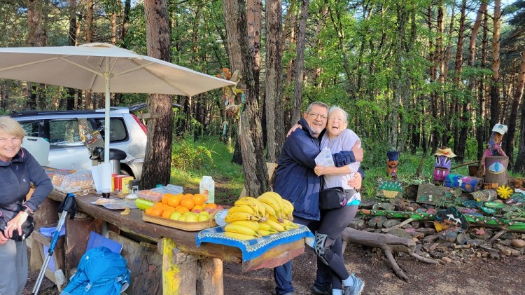 We stopped at pilgrim rest stop in the woods: Descanso Para Peregrinos. There is a donation table with fruit, Danish, coffee, water. The gentleman was multilingual. He had remixes of American dance music playing. He said we should move to Spain because the one rule in Spain is – “You do not live to work, you work to live.” He said we should live in more Southern part of Spain because the women in Burgos in northern Spain, starting in November, they don’t have babies, they have penguins it’s so cold.