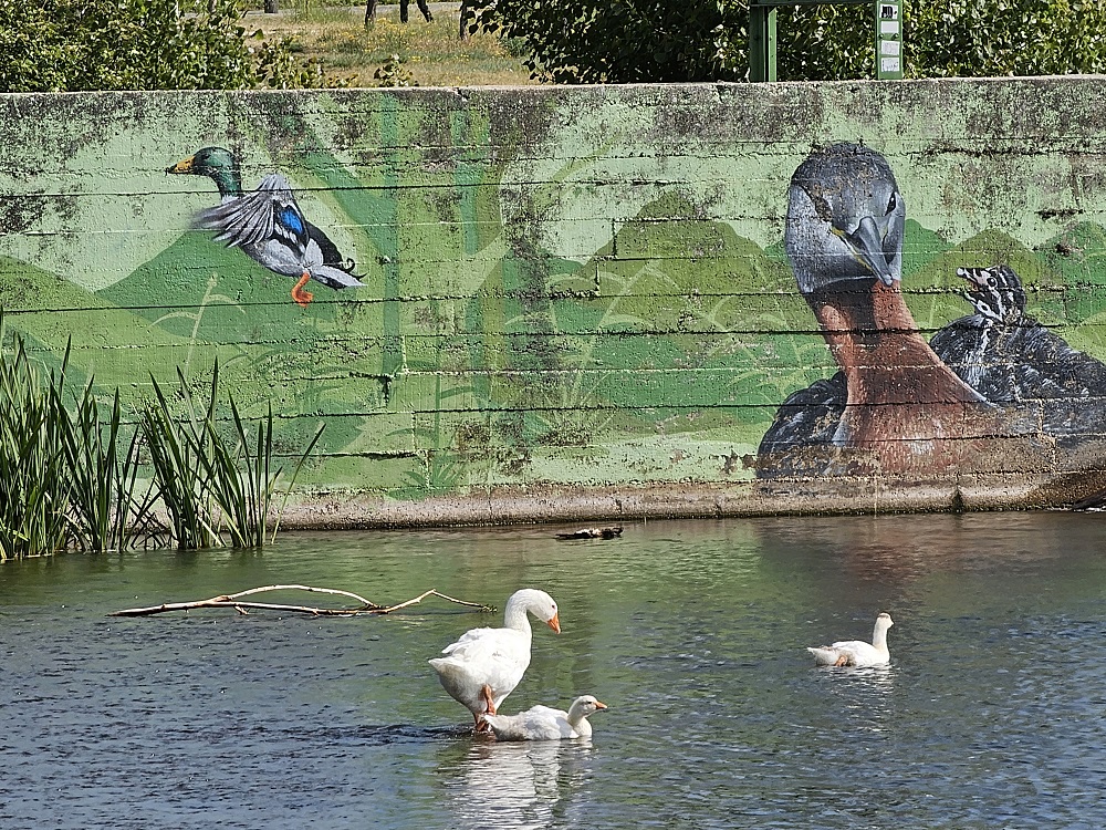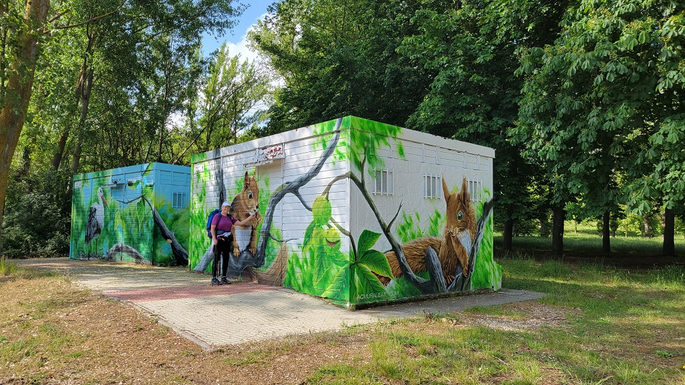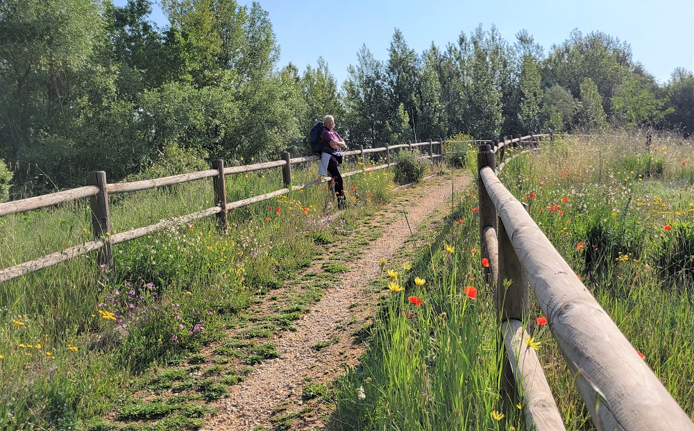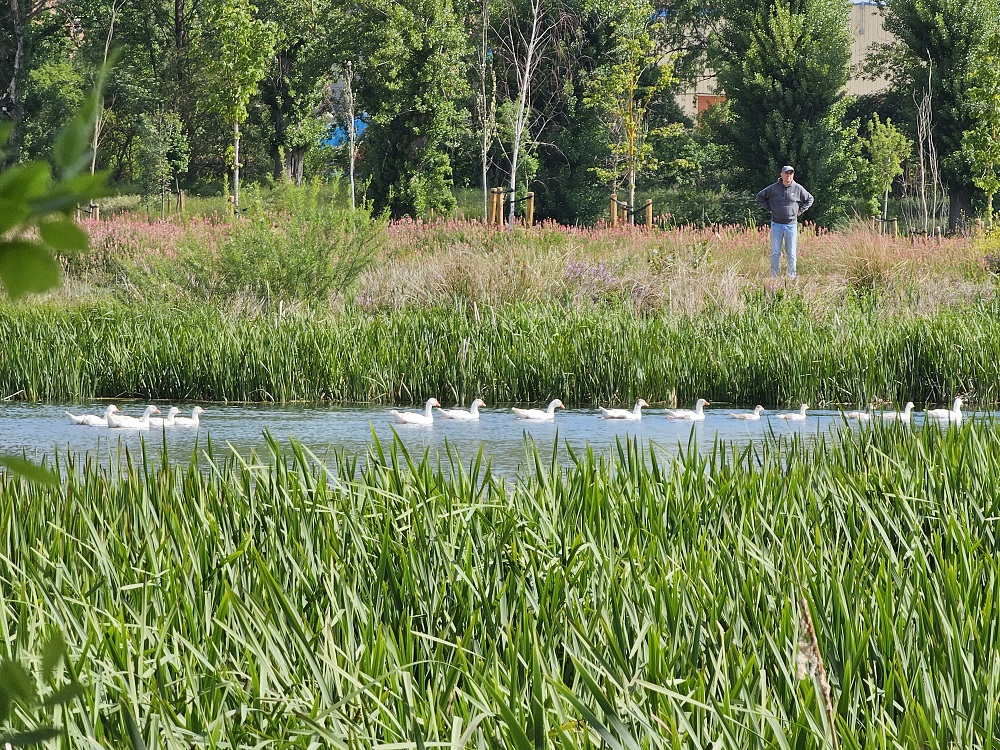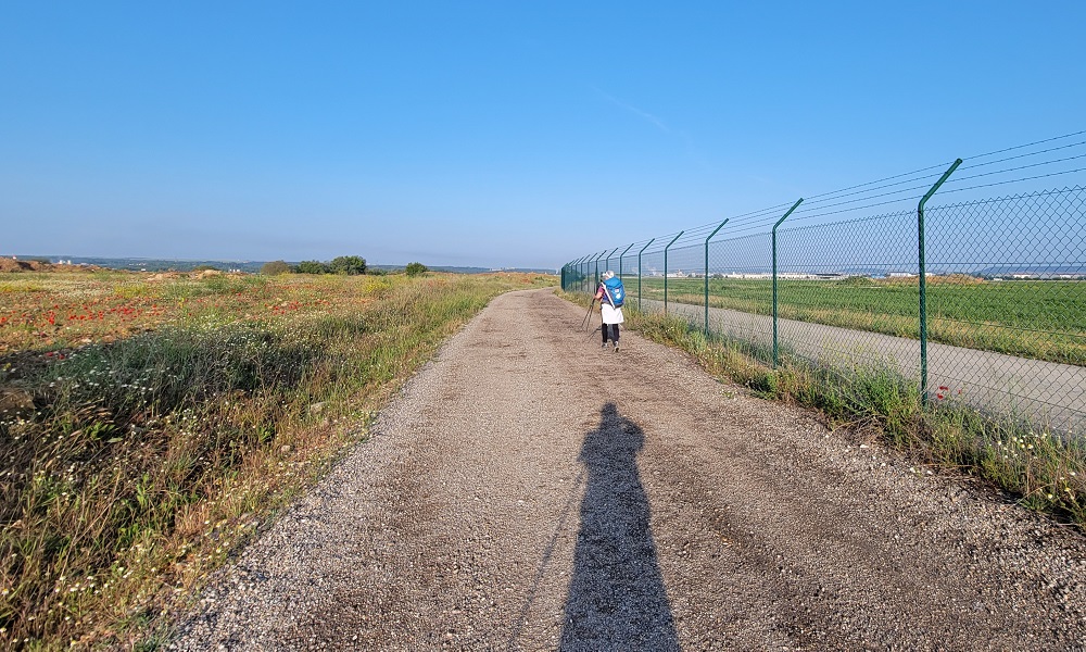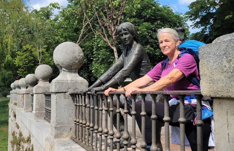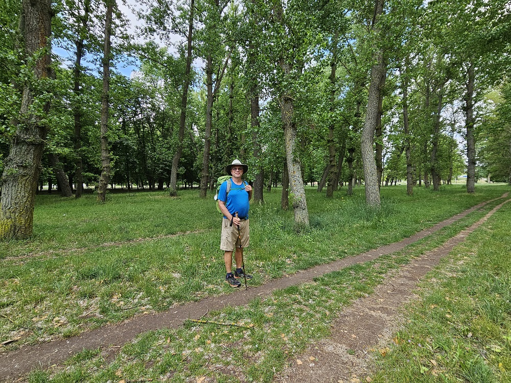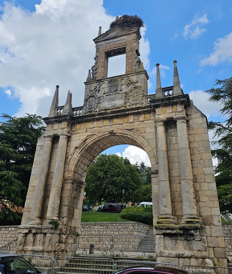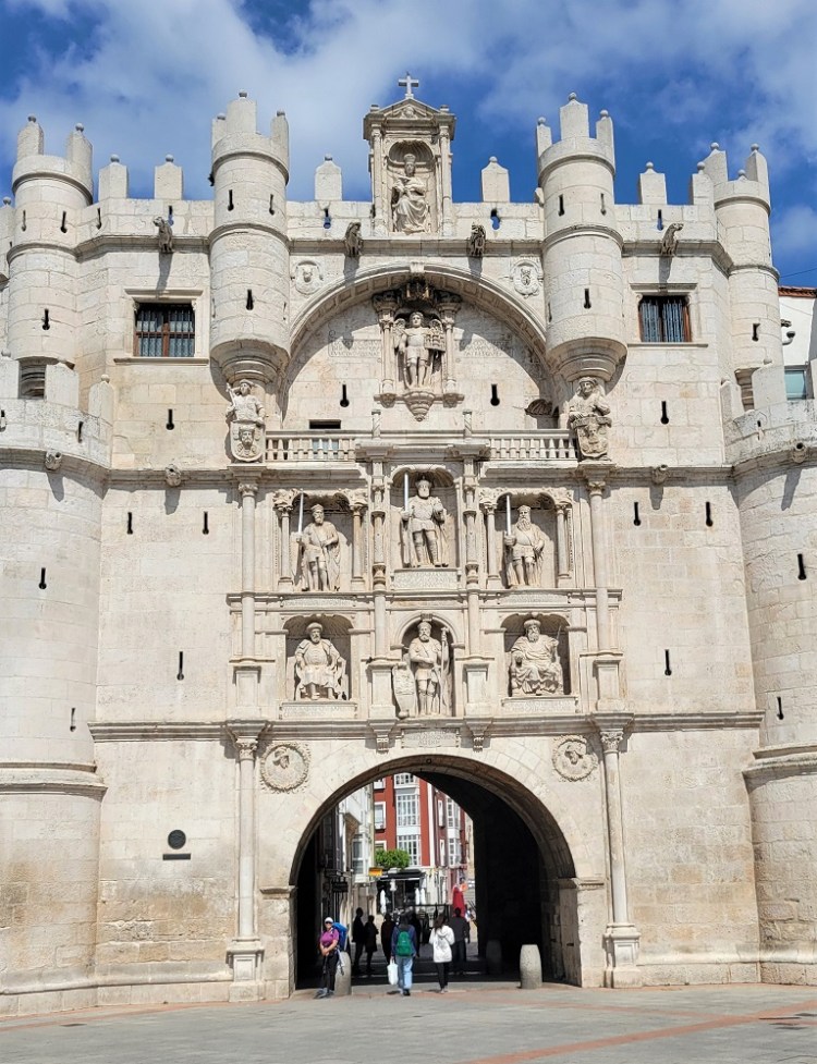 There is a “secret” (not really but it seems that way) left turn before Burgos Airport that takes you off the main roads, off blacktop and concrete and you avoid the newer sections of this over 170,000 people city. The greener, softer ground and visually pleasing path we took is easy to miss the turn if you are not looking at your book or App. The yellow arrows pointed straight and we made a left. We saw 2 dump trucks and a large tractor on the way around the airport at the beginning of our day but did not walk beside or come anywhere near a single car for the last 7 miles into Burgos. Just as expected (we have done this route twice before) the Rio Pico park walk was awesome. We walked through the entire park shortly after leaving this morning until we crossed a bridge into the older section of Burgos where the Cathedral and a fun Plaza are located.