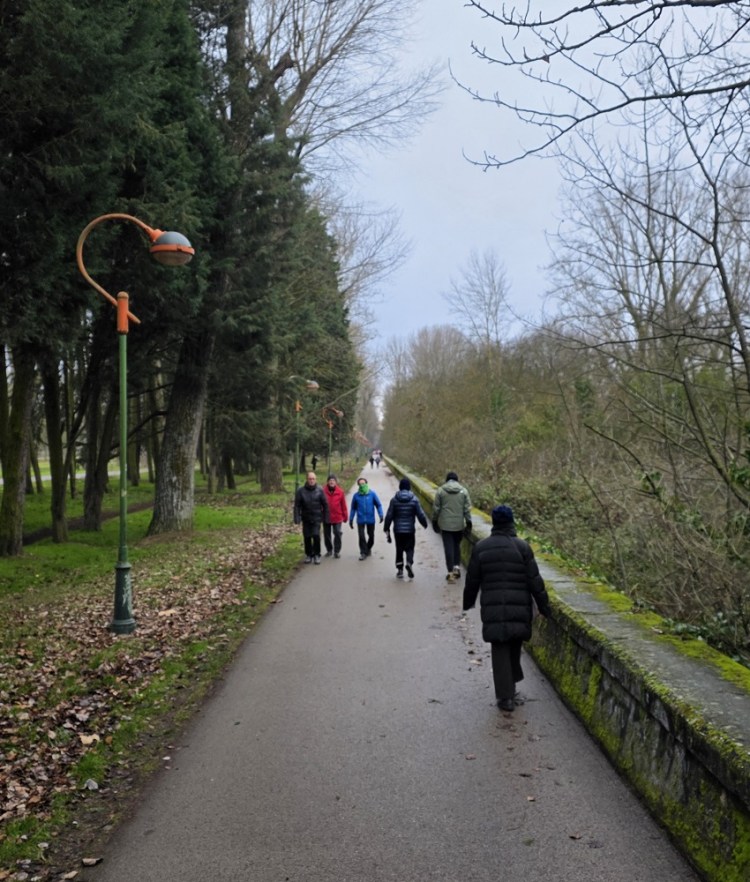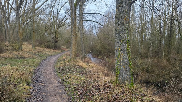 Today started by going to the hotel receptionist and requesting a taxi for the ride back 9 miles to Cardenuela Riopico. All went smoothly and I was walking by 8:08, still dark, but I could see well enough. The road walk was actually over 2 miles before I took an alternate route around the Burgos airport so I could walk along the river in to town. My goal was to walk the 9 miles and stop for a pizza at my favorite Burgos restaurant. I had just missed the 3:30 cut off yesterday. The path around the airport is a dirt road. I saw one local out walking his dog. A little over 4 miles in you cross the N120, the road we have paralleled since Roncesvalles, and entered a Burgos city park. We normally follow bike paths for the first part, but everything was very wet and muddy, so I stayed on a sidewalk. Soon enough you can walk on grass and dirt paths and eventually as you get closer to the city center there are lots of people about. It was misty and about 40 all morning.