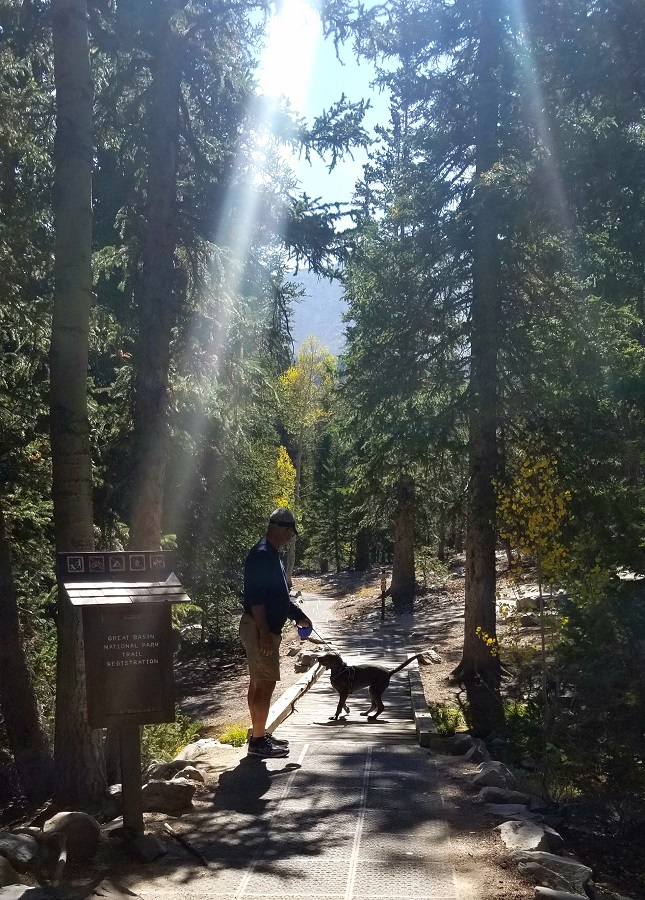 We drove up to Wheeler Peak. Rangeley was overjoyed to see Lehman Creek had water to play in at 10,000 ft. at the Bristlecone Grove and Alpine Lakes trailheads. Dogs are not permitted on any trails in the park so we could not go to either of the fore mentioned hikes. But the views, stream, autumn colors and low 60’s temperature up there was awesome! The campground at the top was closed for renovations but the two others on Wheeler Peak were full.