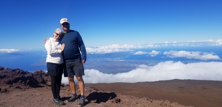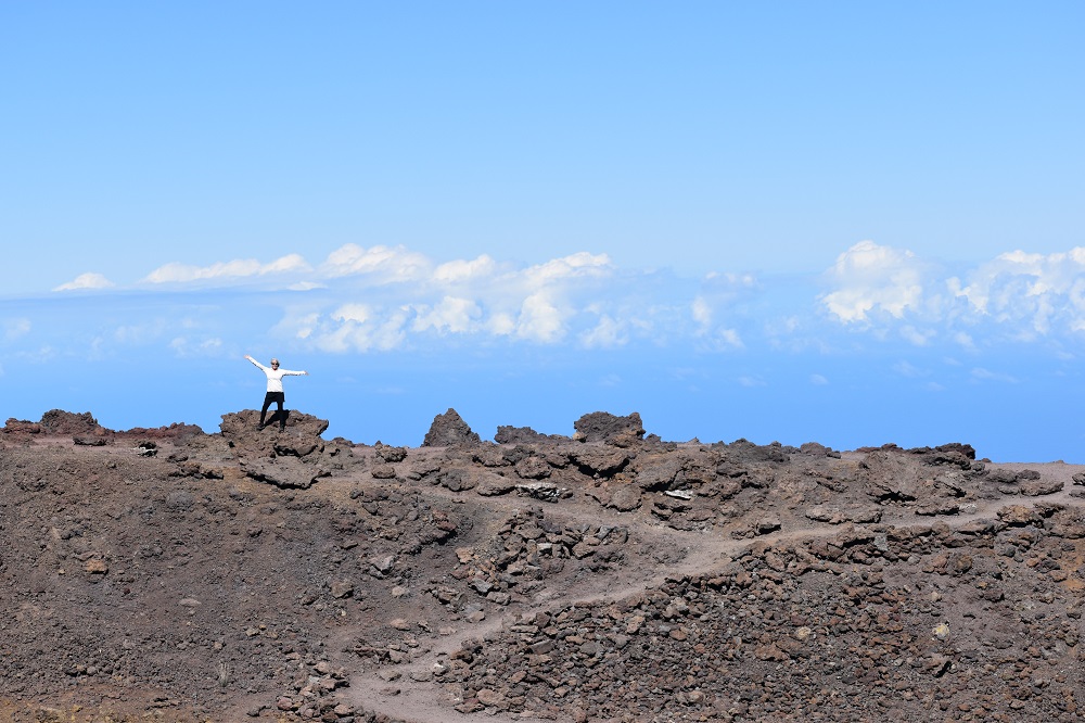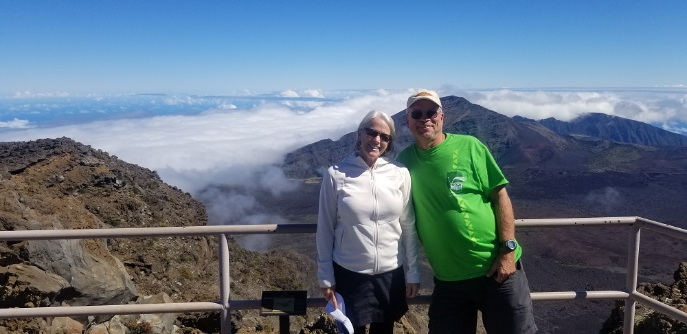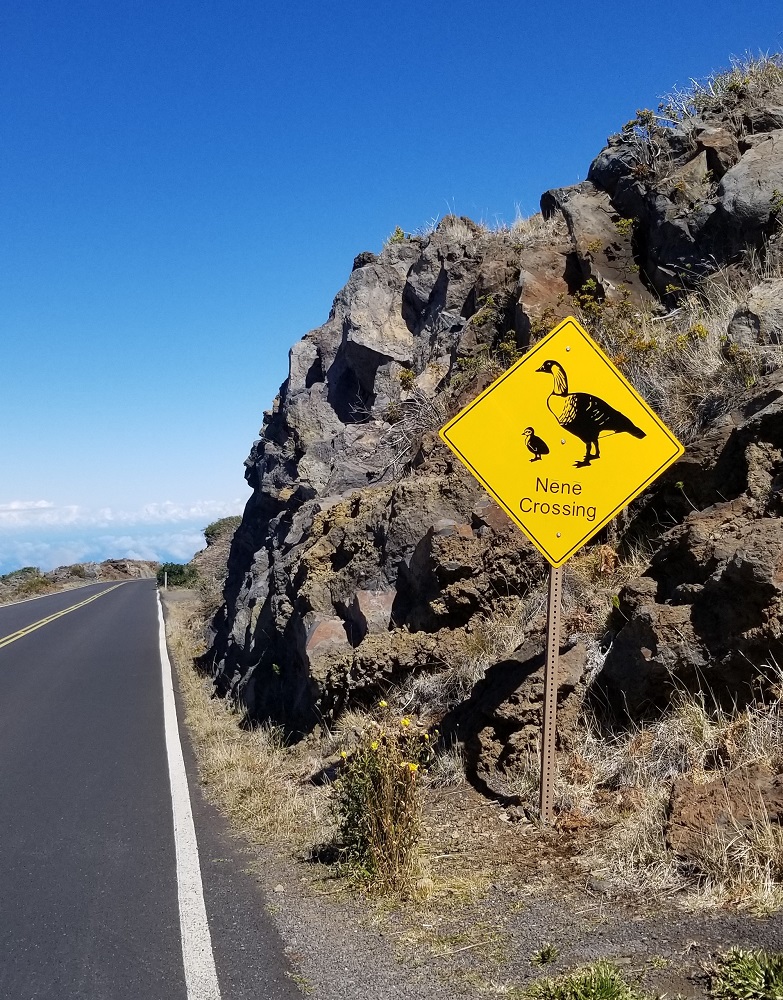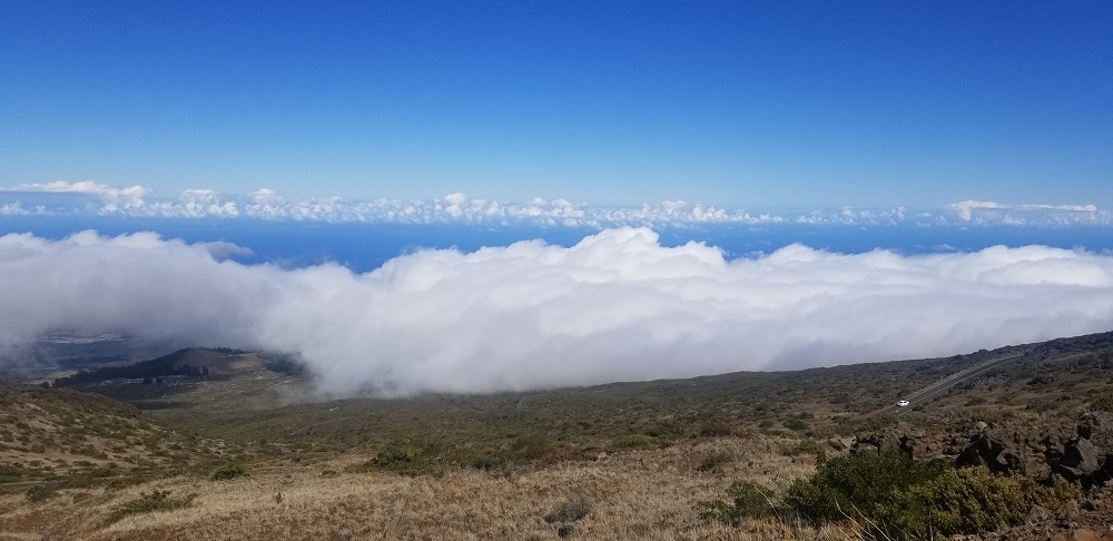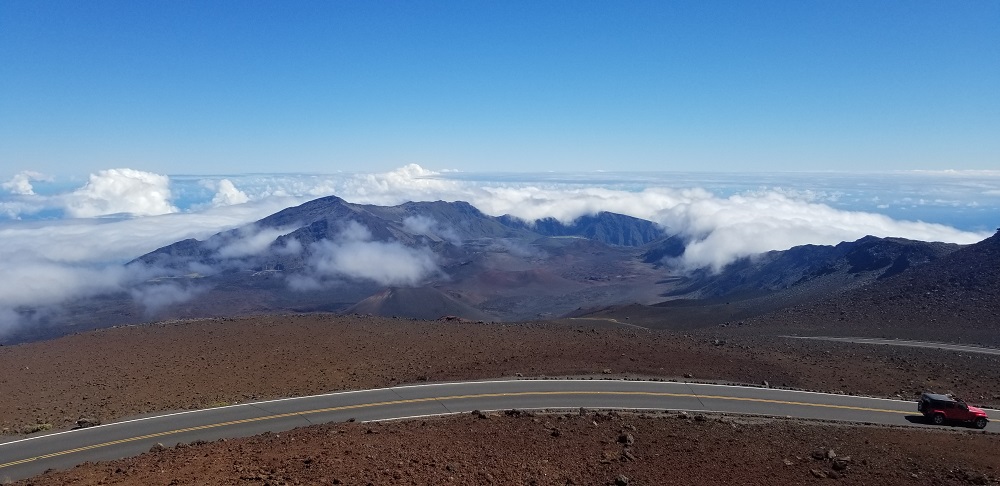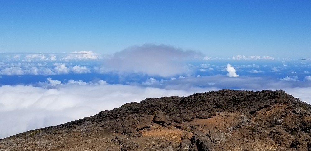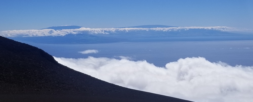 Per recommendations on the NP website and the known height of the mountain, I had packed a lot of warm clothes for this part of the trip: layers including a light down jacket, gloves, leggings and warm socks in addition to a rain jacket which I have already used several times due to heavy rain fall in America Samoa. After breakfast at the Maui Seaside Hotel we hopped in our rental car, asked Google directions to the mountain and headed out. The mountain was visibly clear to the top in the AM and like most high mountains, it gets socked in with clouds very quickly late AM to early afternoon. The road to the top is about 40 miles long but due to the slow, very windy road it took an hour and 20 minutes to get there. We lucked out with the weather today! It was 53 degrees at the top. For us Phoenicians it was still chilly but it can get to 35-40 degrees up there in bad weather. It was clear and beautiful with no wind! We could see the Big Island’s Mauna Kea with snow on its roughly 13,800 foot top and Mauna Loa at just a few hundred feet lower 100 miles in the distance.