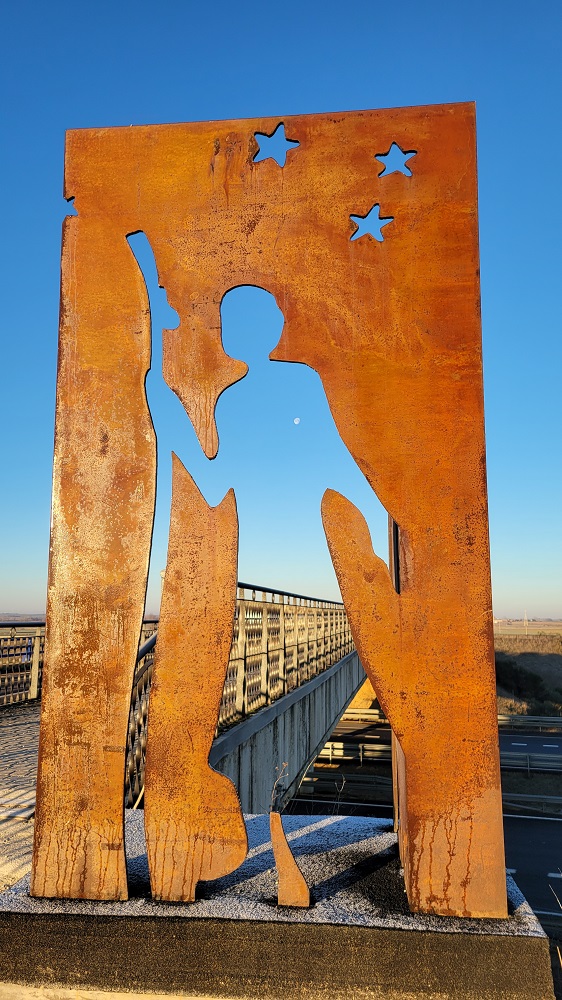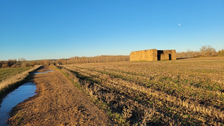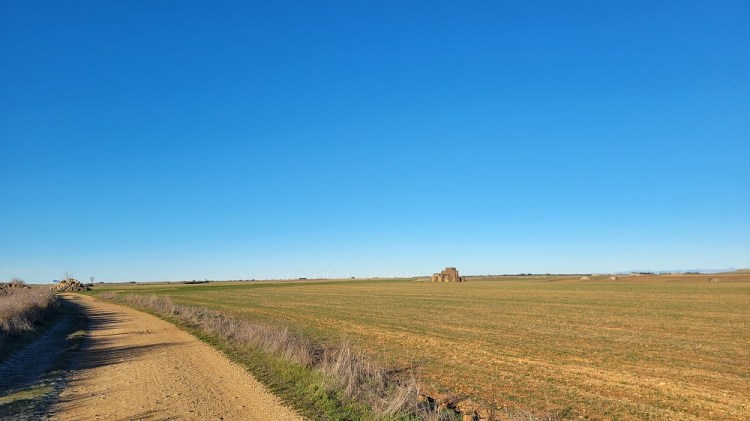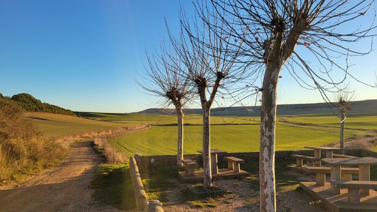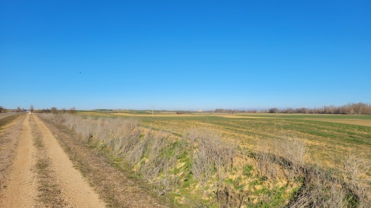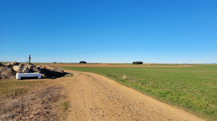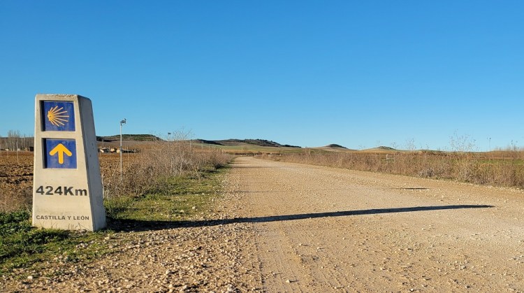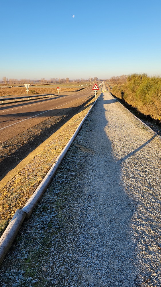 The Meseta is fairly uneventful in the summer. In the winter it is … fairly uneventful I guess. I did see 2 pilgrims I “walked” with for about 5 miles. A young Asian couple in their 20s that don’t speak English. I did get in a walking groove today though. I walked over 8 miles before sitting down. There was a town 7 miles in and there was a bar (café) open, but it was dark with 1 local inside and I had brought food with me today, so I just kept on walking. I was looking for something to sit on, even a rock, but there was nothing along the dirt road I was walking on. Finally I stopped and walkied to the edge of a field and sat on an irrigation box. I took my shoes and socks off to air out my feet. The temp was 40 with a slight breeze. When I went to put my socks on I realized how cold my feet were. Next stop I left my socks on.