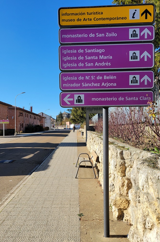 Driving from Carrion back to Fromista I saw 11 pilgrims. There are others out here, but when we are walking the same direction you do not see many people. The road is flat and straight. The taxi driver was going 120+ km/hr (75 mph) on the stretches between the towns. At the entrance to each town is a big speed bump. We went over then at less than 20 mph. The towns are old, so the buildings are very close to the road. Once out of town we would speed right up again.