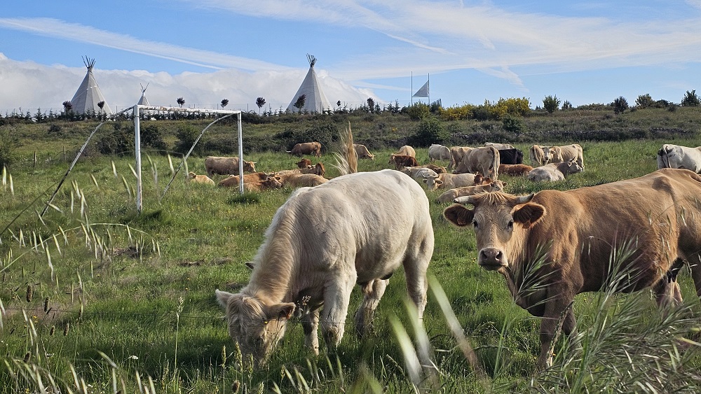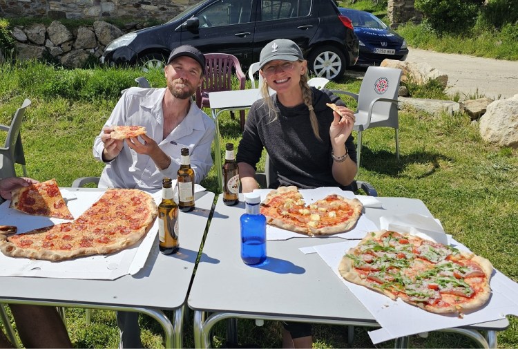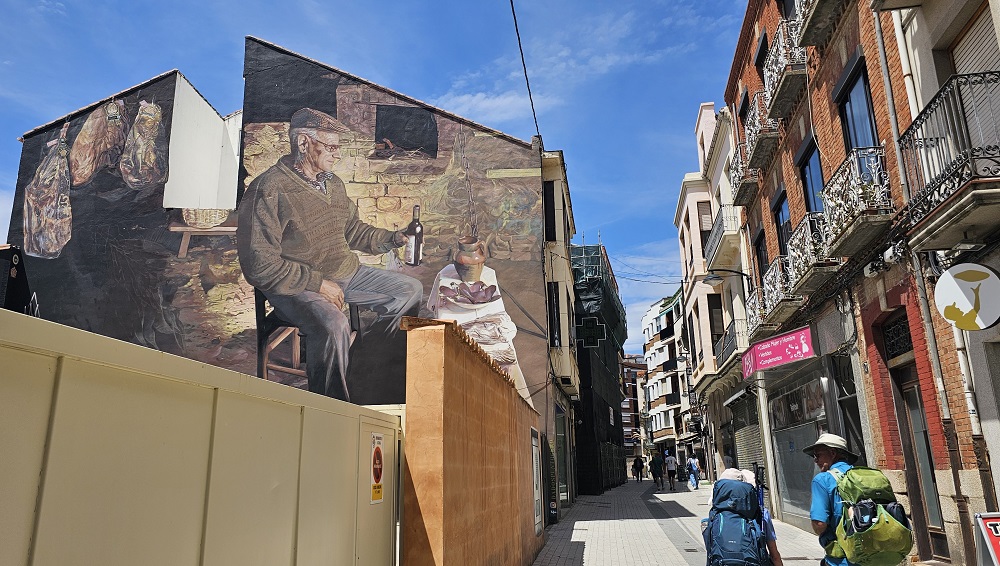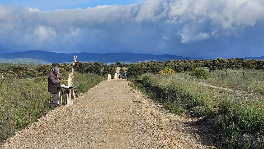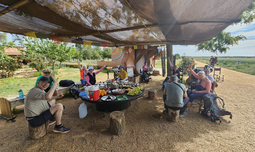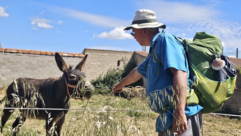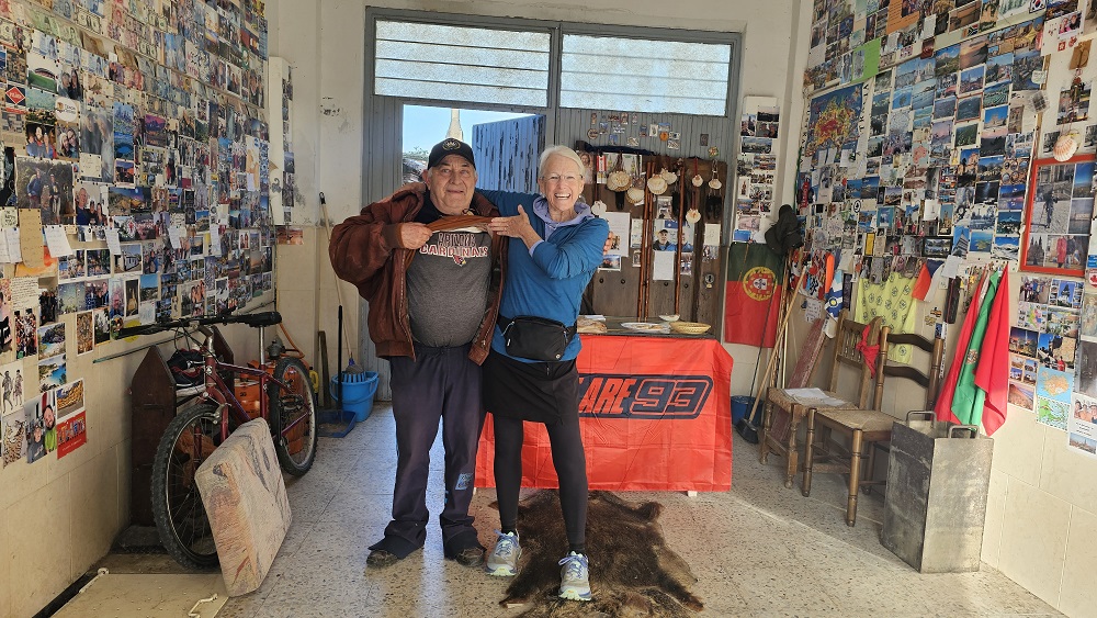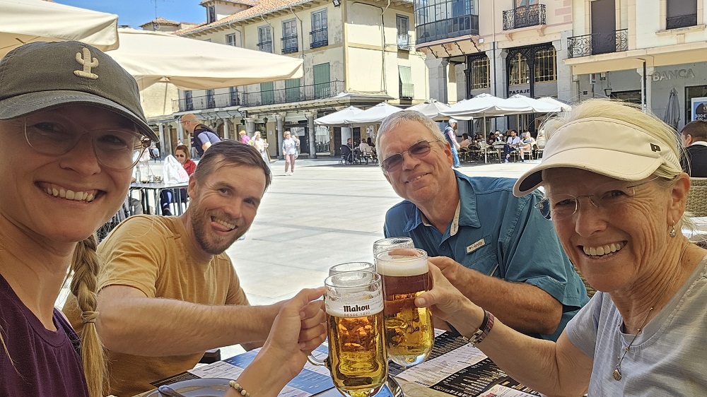 On the way to Astorga we stopped at our “friend’s” place, Senor Perez. We first met him in 2019 and saw him again last year. We had sent him, at his request, an Arizona Cardinals tee shirt after 2019 and pictures of our visits in the past. Today, randomly, believe it or not, he was wearing our AZ Cards tee shirt!! He’s so happy to give you a little flat bread he makes in his large Adobe style wood fired pizza oven. He made us fresh OJ, looked all over his property to find the 5 newborn kittens he has but mama gato/cat had apparently moved them and he shaved a bit of Iberico pig, prosciutto, from a pig’s leg he has in a back shed! We got the typical European kiss on both cheeks when leaving. We hope to see him again.