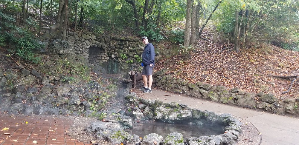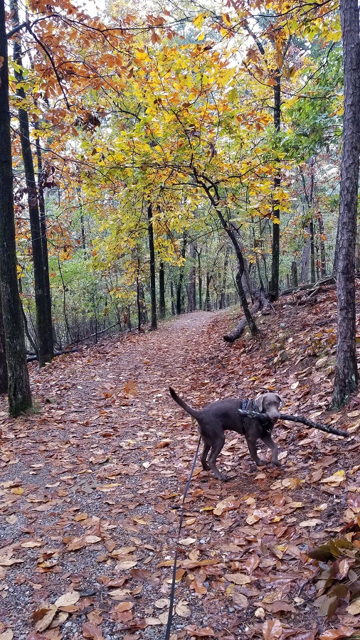 Rangeley and I took off on a great hike, starting from the visitor center in town. It is a fairly steep half mile to the top of Hot Springs Mountain where the tower is. We continued through the beautiful forest to do a loop around the mountain. The total distance was a bit over 3 miles. There were plenty of sticks for Rangeley, but true to form after about 4 or 5 he picks one out and carries it the rest of the way. The chosen stick was about 5 feet long which is a nuisance when he wants to pass me, so I broke it in half. His stick was at least 2” in diameter. The hikers we pass all seemed to have a comment about his “stick”, “prize”, “present”, etc. It is funny the comments he gets. In town while waiting for Elizabeth to come out from the bathhouse, a gentleman came up to me and said how Rangeley was the most beautiful dog he had ever seen and thanked me for letting him say hi. He didn’t even pet Rangeley, just literally said hi from 5 feet away. Later Elizabeth was in the Walmart parking lot waiting while I went in to get a couple things, and two separate parties went out of their way to talk with Elizabeth about what a handsome dog he is. We have never travelled with a dog before, but it has really surprised us how many people come up to talk to us about Rangeley.