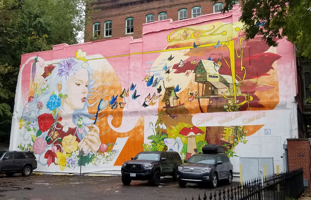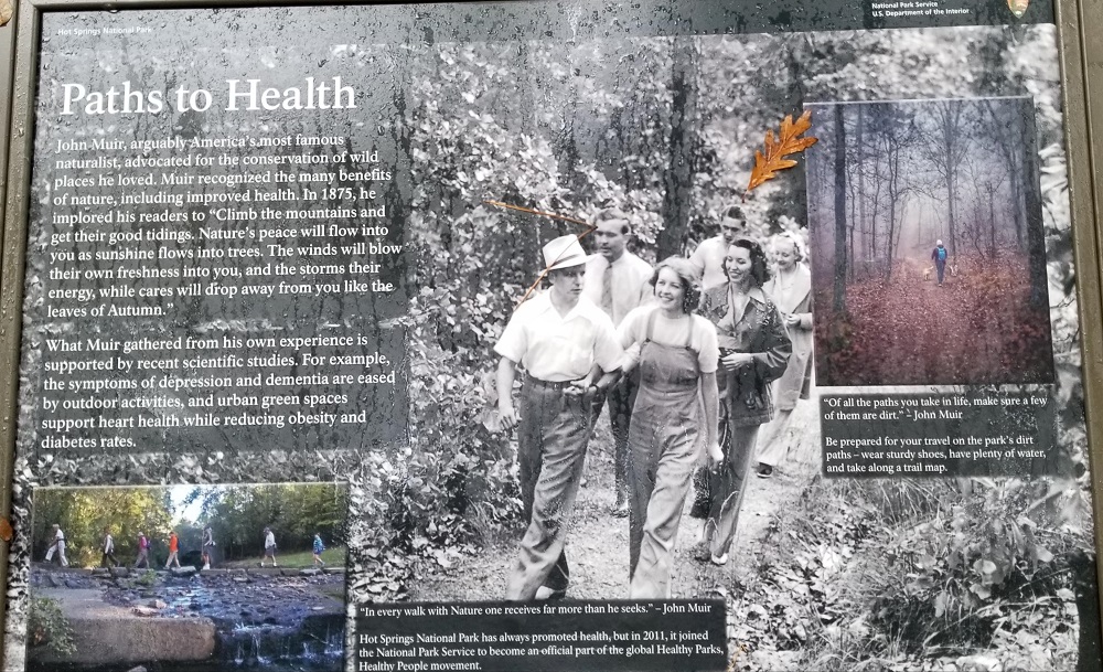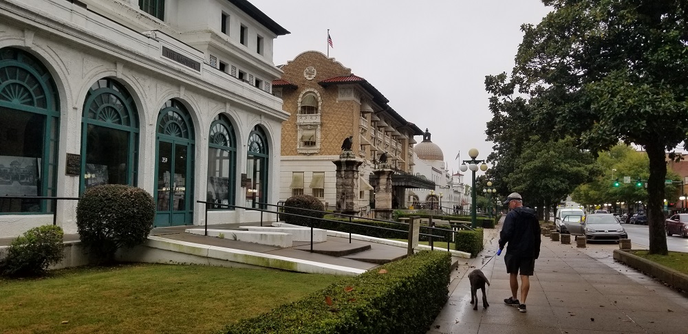 Although today was not much clearer, nor much dryer than yesterday, it was not pouring and the forecast was for cloudy but no real rain as the day progressed. We took our traditional pic at the NP sign, although, like in St Louis, it is right in town. We parked on Central Street (“main street”) and I ventured off to Quapaw Baths and Spa and Gary and Rangeley went hiking on the Hot Springs Mountain Trail. The Quapaw, named after an American Indian tribe that used to live here, opened in 1922 and closed in 1984. The bathhouse industry drastically declined after WWII due to increase in modern medicine. The beautiful tiled dome historical building was reopened as a family-oriented spa. It was $20 to enter and walk-in only. There’s a locker room, towel service, very friendly staff and a great experience. You can stay as long as you want in the four pools, each a different temperature. Pool shoes and bathing suits are required as well as social distancing in the public pools. I kept my mask on but it is not required. I soaked in three of the pools starting with the 95 degree pool, then 98 degrees and finished in the pool kept at 102 which was hot enough for me. The forth pool is 104. The attendants were fabulous, assisting me with my crutch on the wet tile floors, providing water to anyone who wanted it and checking with everyone throughout their stay. There is a limit of 30 people in the large four pool room. It was a fabulous way to relax, emotionally and physically, quiet my mind and muscles. Gary will talk about their hike below.
