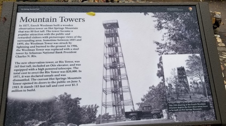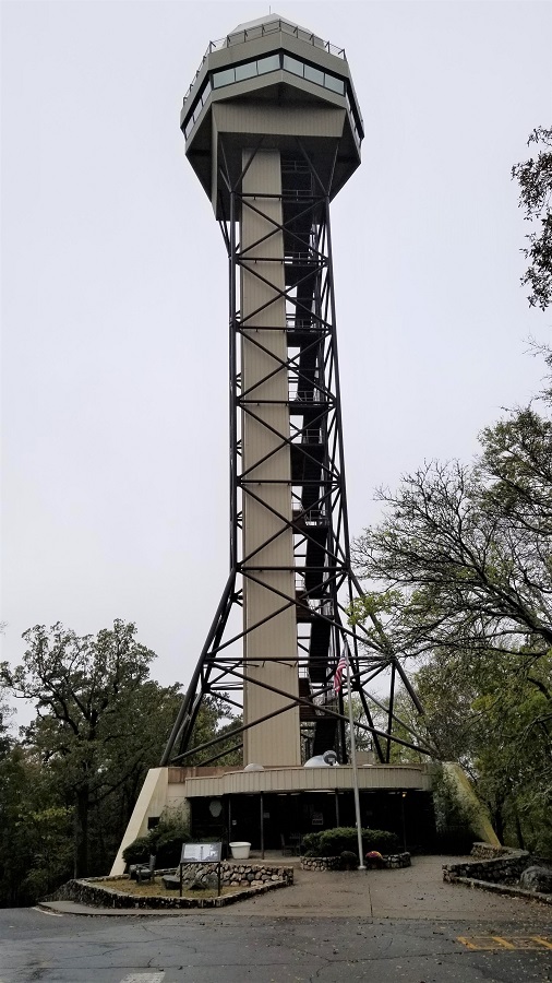 The three of us met up after a couple hours and we drove the Hot Spring Mountain Drive to the Rix Tower, originally built in 1877. The structure now standing was renamed the Hot Springs Mountain Tower and is the third tower in this location opening in 1983. The first tower was lost to fire, the second deemed unsafe and torn down. It was very cloudy but the gift shop at the base of the tower was open, there are restrooms and I took the elevator to the top (183 feet high) since I am not able to due stairs or hike right now.