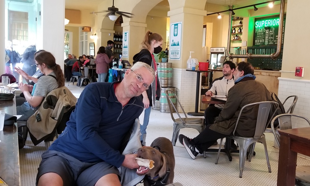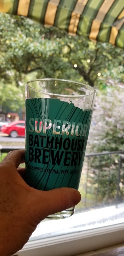 Our last stop in Hot Springs was at Superior Bathhouse Brewery. We were seated inside, all three of us, including Rangeley! There were two other dogs in the restaurant while we were there. Our meal was great, we enjoyed one of their beers, the staff is very dog (and people) friendly and we enjoyed looking out at the historic downtown district from our window seat.