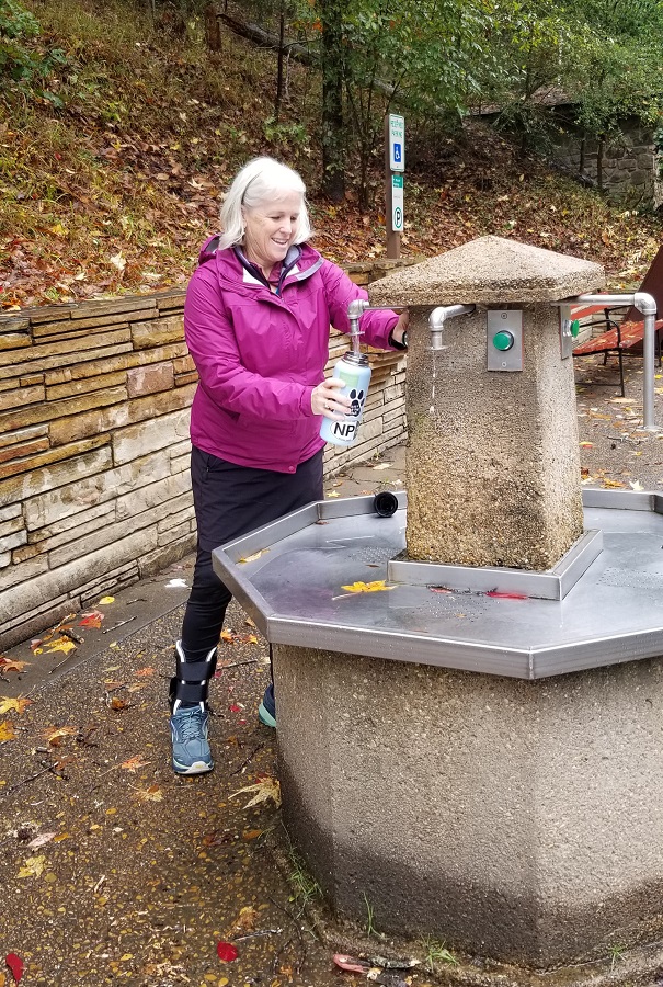 At the base of the mountain we stopped to fill our water bottles in the Happy Hollow Spring fountain. The mountain spring water is free. It is collected at this location at 2 gallons per minute and an average of 62 degrees. The sign there states the mineral contents of calcium, potassium, magnesium, and more. It tastes wonderfully healthy!