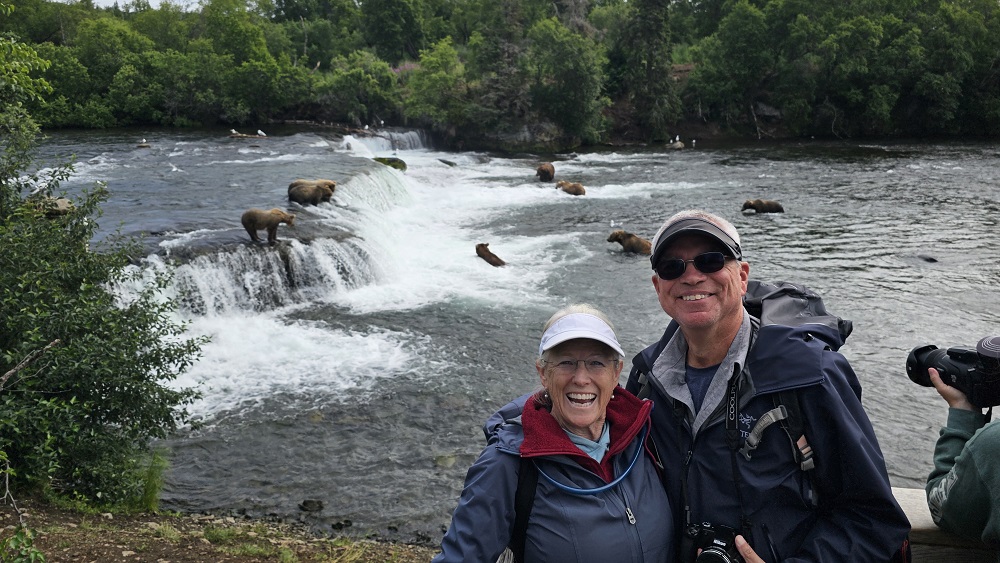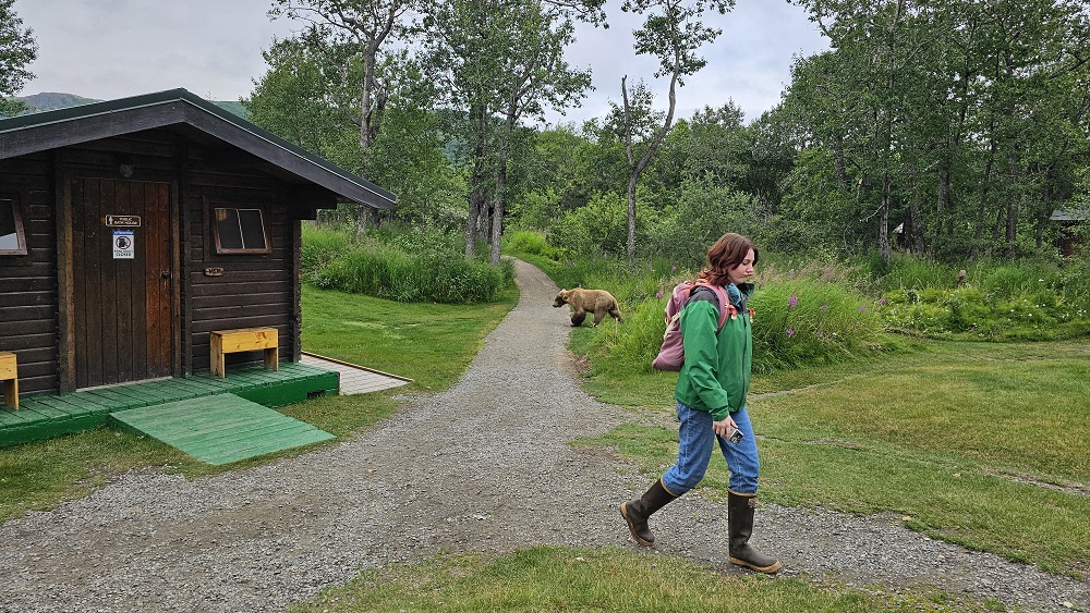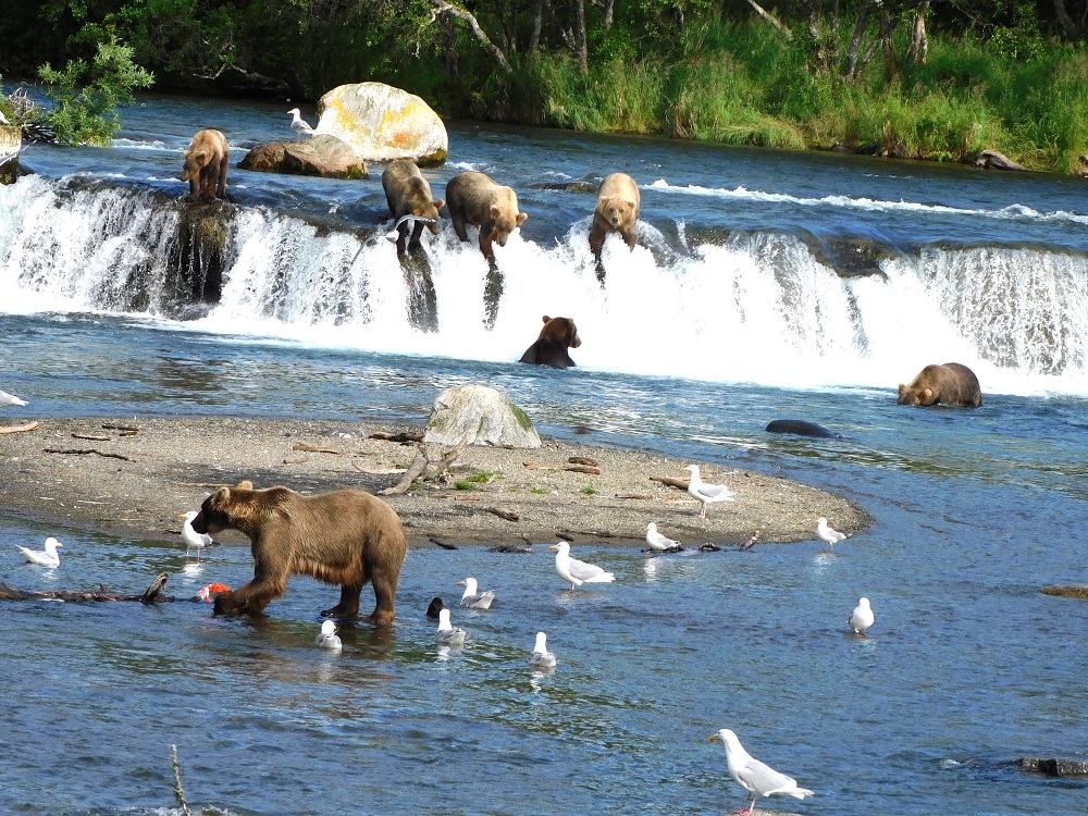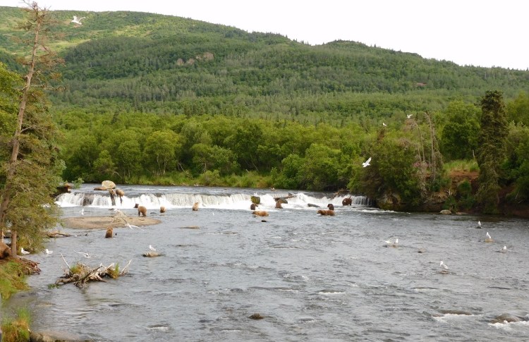 Today we went to Brooks Falls in Katmai National Park to see brown bears catch salmon in a river!! OMG! We have been watching the live webcam the national park service has on their own site and on YouTube from home. Finally, we were there in person!!