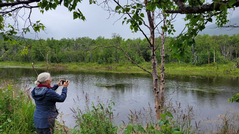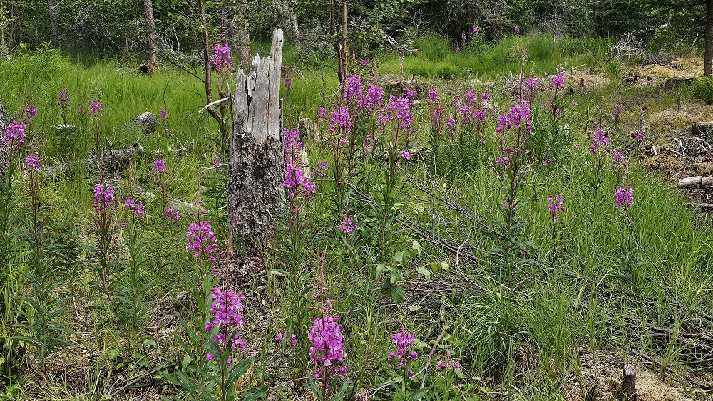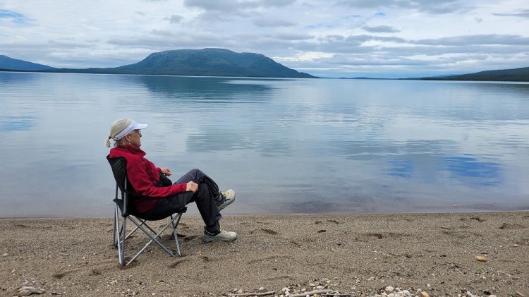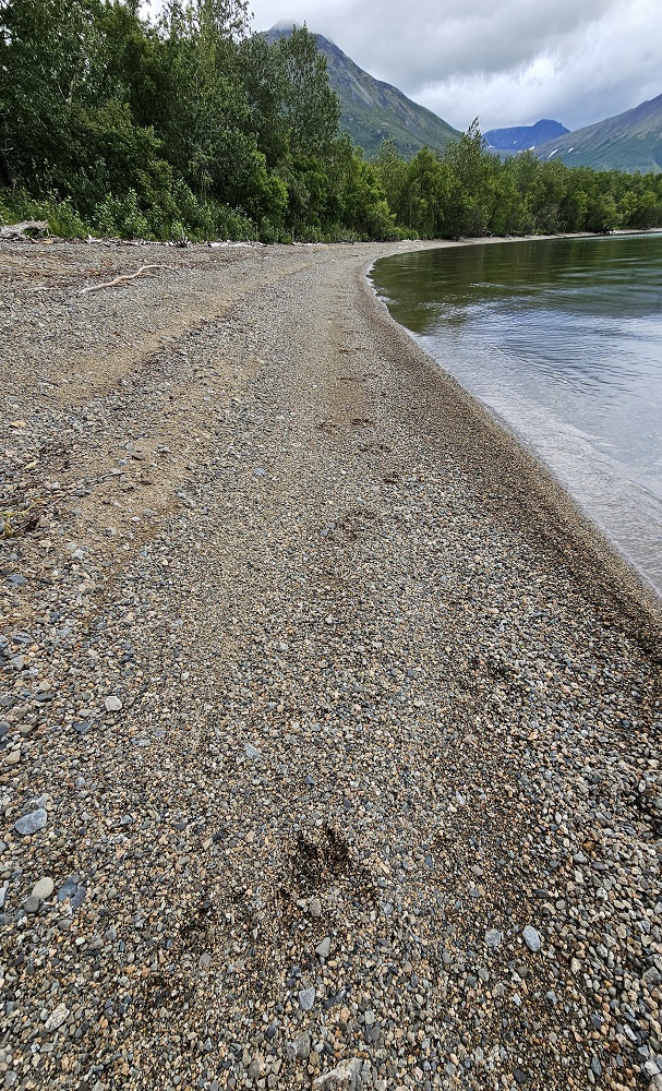 Our second stop at Grosvenor Lake brought a sighting of a Bald Eagle in a tree; a hike down the beach to view a beaver lodge; we saw a salmon swimming in the lake, and the highlight for me…all the wolf and bear tracks as well as scat (poops), I mean lots! And fresh. Maybe this morning or possibly last night. We enjoyed a bagged lunch and chatted overlooking the lake. Not a single additional soul to be heard or seen.