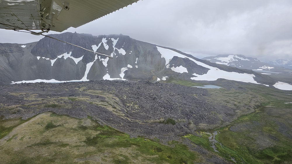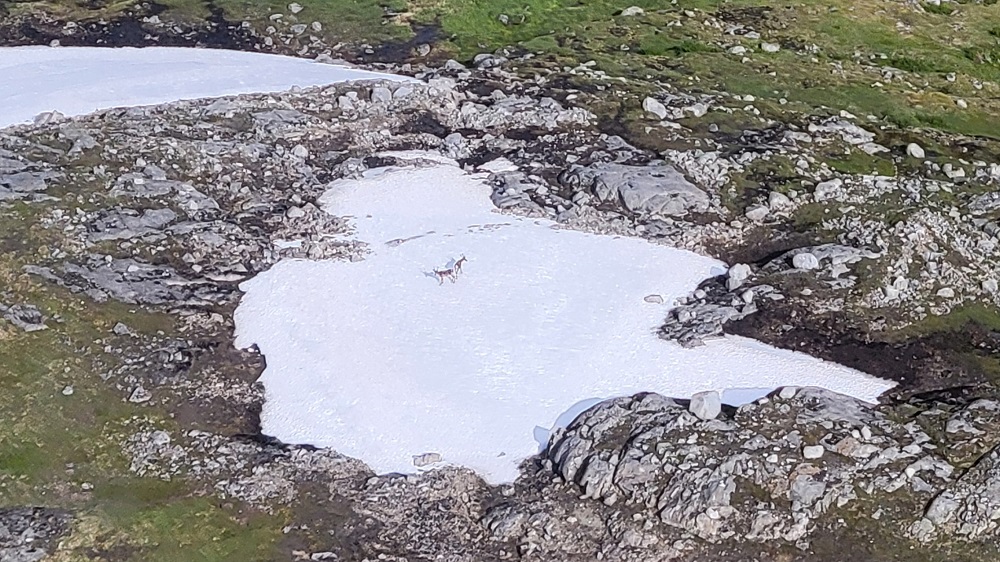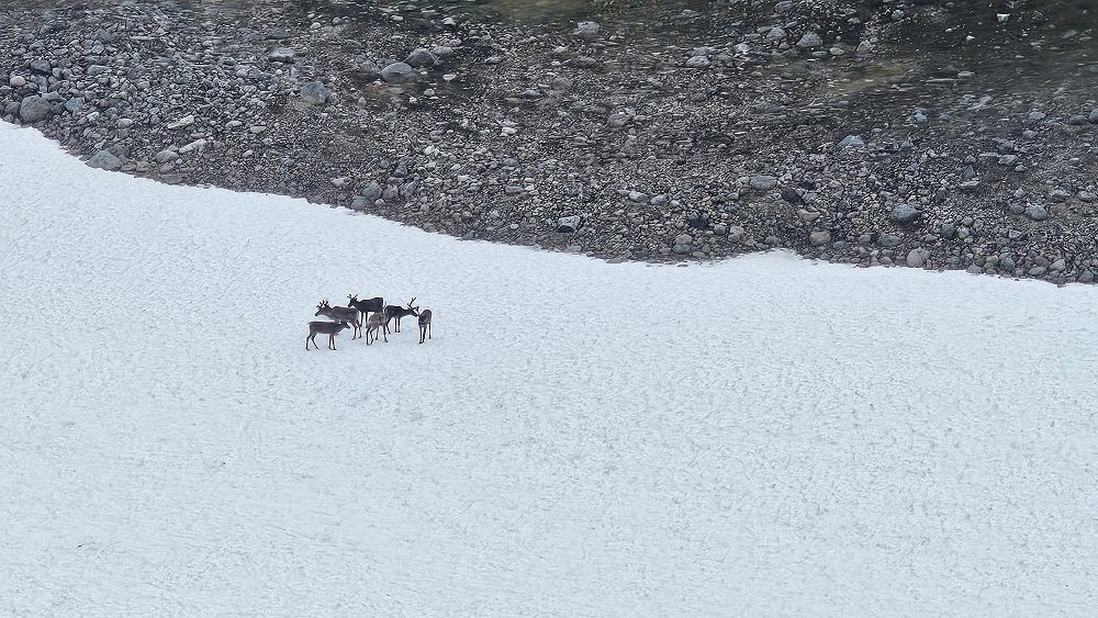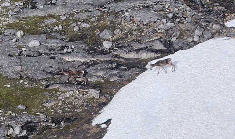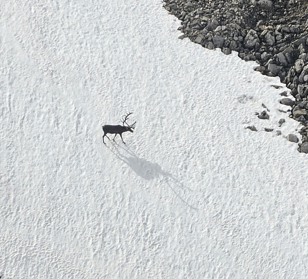 Caribou were on the embankment camouflaging themselves. As well as sunning themselves (actually getting away from the bugs) on snow fields.