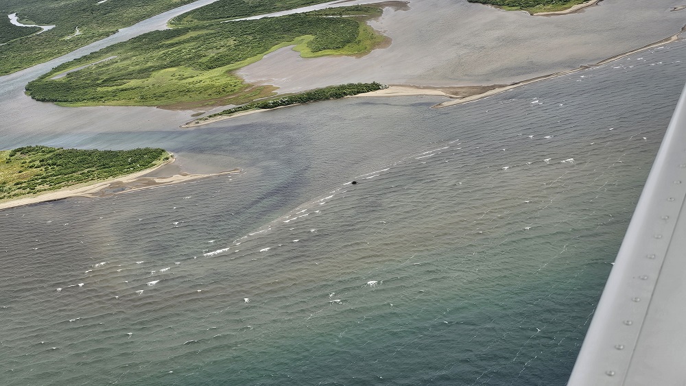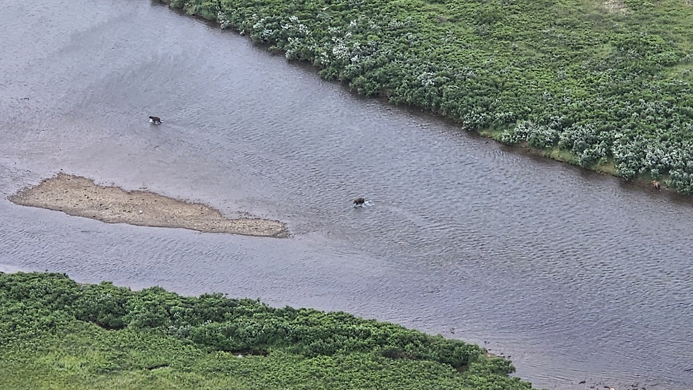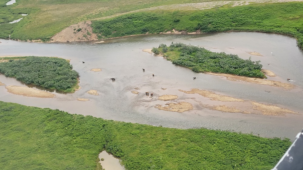 A Bald Eagle flew beneath our plane while we were flying over Moraine Creek looking for bears. Two bears were chasing salmon as they playfully romped through the icy waters trying to catch lunch! Many bears were on sand patches, in the very wide creek or along the grassy knolls and banks. There were rafts in a few places in the water. Carlon said they were people fishing for the salmon. The water was so clear we could see thousands of salmon swimming just under the surface!
