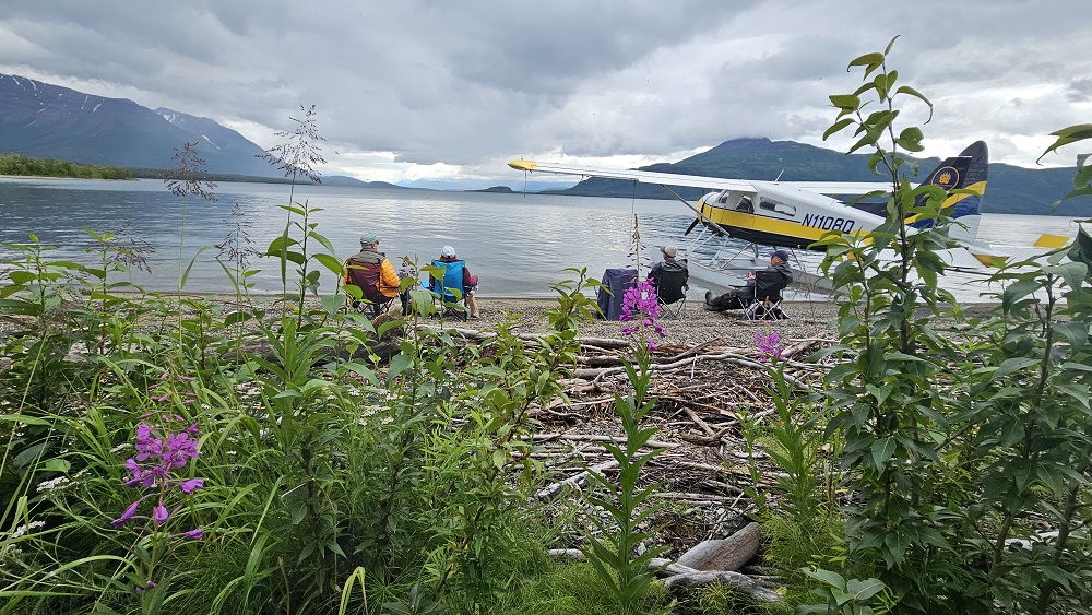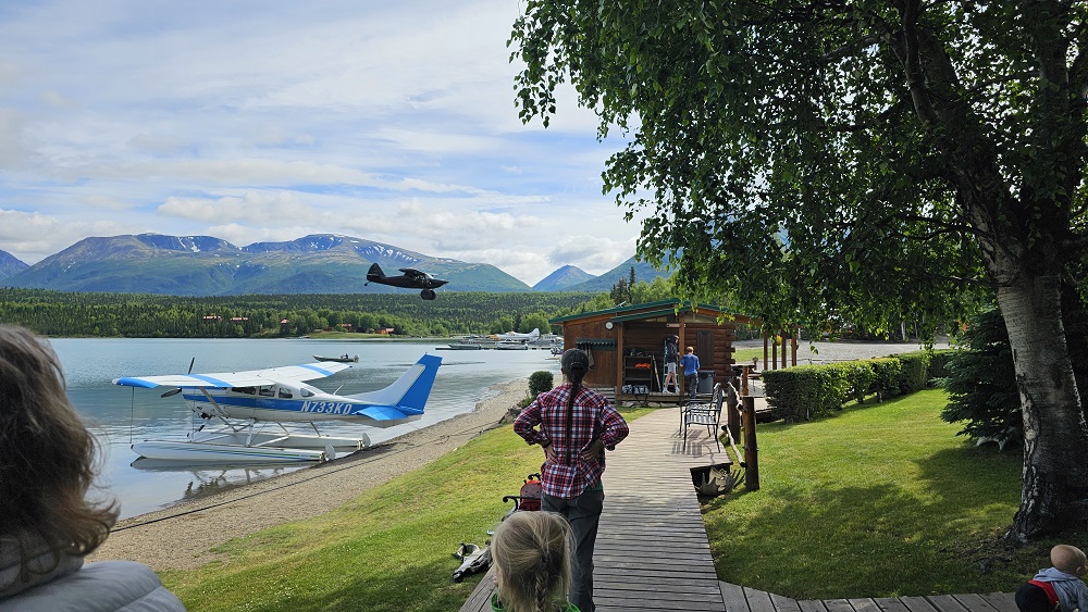We had two 4 seater float planes that took Sherry and Craig up in one and Gary & I in another. We were flown by Glen Alsworth Jr.’s son, Sasha. Zoe, a staff member and another Alsworth relation rode with us. Glen Jr. is Zoe’s uncle. Lots of the staff members (not all are family) take excursions on their days off to get off the property for the day. There’s only 150+ residents in Port Alsworth and can only be accessed, for the most part, by air. Anchorage is an over 1 hour flight.