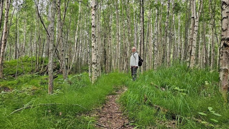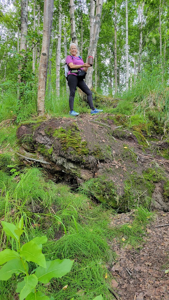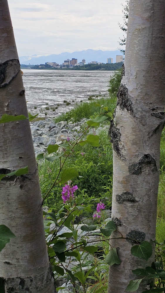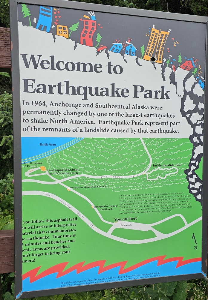 We scheduled our first day with no plans. After looking up many outdoor options, we chose to go to Earthquake Park. In 1964 a devastating occurrence happened to this southwest section of Anchorage with an over 9.0 quake, one of the worst quakes in North American history. The area was honored by making it a lovely park with bike and walking paths, geocaches secretly blending into the beautiful forests with gorgeous views of huge mountains and the city’s skyline flanking the Pacific Ocean’s Cook Inlet.