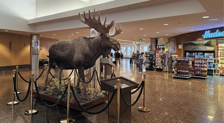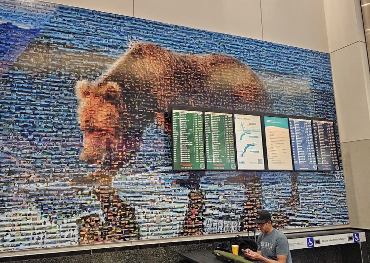 I love the practical, casual look of most of the travelers. Almost everyone wore a large backpack vs pulling a roller bag. The standard attire was Carhart style work pants or hiking attire, ball caps and some form of boots, whether that be hiking, work style or rubber, and the line at McDonald’s was longer than at Starbucks! The people who checked in ahead of us had 5 full size coolers packed with their fishing adventure success stories! The ice packed coolers were duct taped shut. So full that the tops didn’t stay latched on their own.