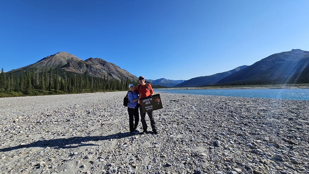 Flew over Kobuk to Gates, got off, another couple brought signs and an American flag, G waded in the cold water and filled his water bottle up with the crystal clear water, I should have done the same, the water was awesome!