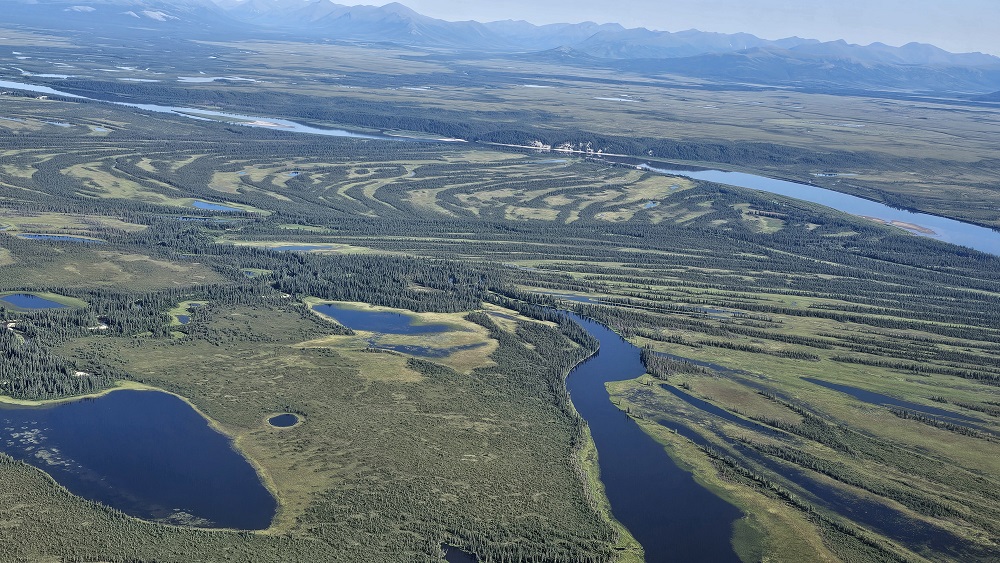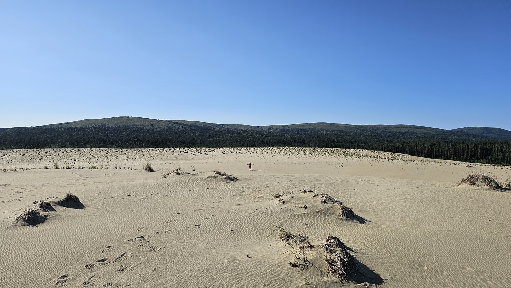 From Wikipedia – Kobuk Valley protects 61 miles of the Kobuk River and three regions of sand dunes. Created by glaciers, the Great Kobuk, Little Kobuk, and Hunt River Sand Dunes can reach 100 feet high and 100 °F , and they are the largest dunes in the Arctic. Twice a year, half a million caribou migrate through the dunes and across river bluffs that expose well-preserved ice age fossils.