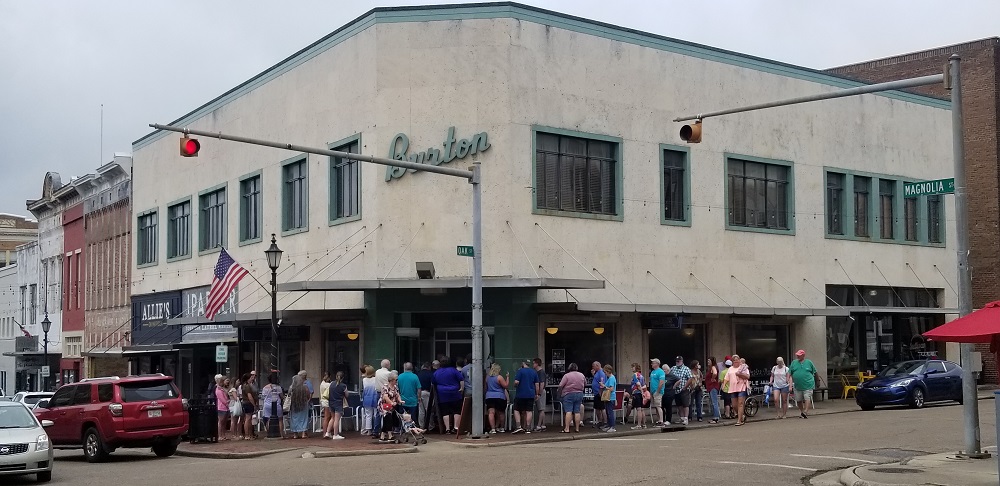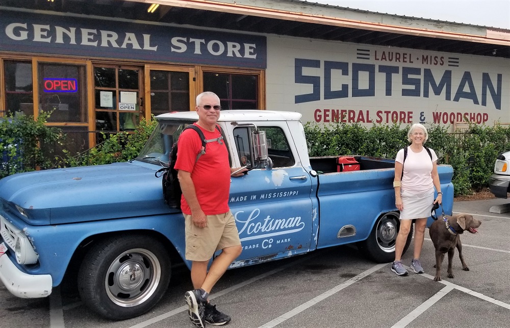 Southern Antiques and Peddlers Junktion were both fun antique shops to wander through before we heard thunder, felt rain and saw the flashes of lighting in the sky. Gary knew right where to go…Shug’s Cookie Dough and Candy Shop! They let us bring Rangeley inside since outside was brewing up a good storm. We arrived there just as the rain poured down. Our lunch consisted of a made-to-order baked chocolate chip cookie in a small fry pan, vanilla ice cream, caramel and chocolate sauce topped with whipped cream! Not sure what was better, the wonderful locals, employees, shop owner, visitors that came and went or the hot sugary dessert we enjoyed for lunch! I asked one local what brought him to Laurel and he replied he was a “Jones County Husband”. I asked him to explain and he went on to say, the men that marry Jones County women become “Jones County Husbands”…the girl’s mama’s won’t let their daughters leave, so the men have to move to the county! : )