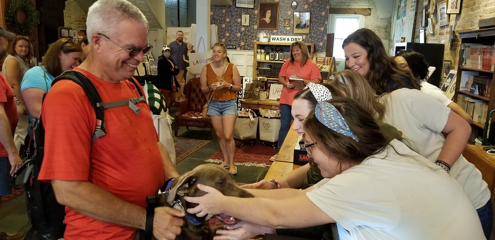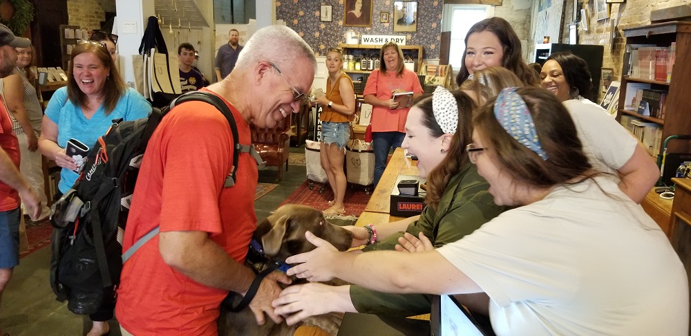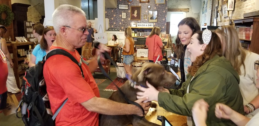 Just a block down from Scotsman is the Laurel Mercantile. Another wall art photo op and they encourage dogs to come inside! Both the Scotsman and the Mercantile are owned by Ben and Erin. I loved seeing the store crowded with shoppers but the big event was when the gals behind the counter “asked” Rangeley to put his paws up on the counter. He was the hit of the store for several minutes! I continued shopping and Gary and Rangeley sat outside on the lawn beside the Mercantile. They seemed to draw attention from visitors and locals passing by. One person asked if he was part of the Laurel attractions! I bought a T shirt, a book by Ben and Erin, a headband (Erin is known for wearing them) and a Mercantile sticker. I love the old pick up trucks at both Scotsman and the Mercantile and was not disappointed in the in-person visits to the locations I have seen on TV for many years now.
