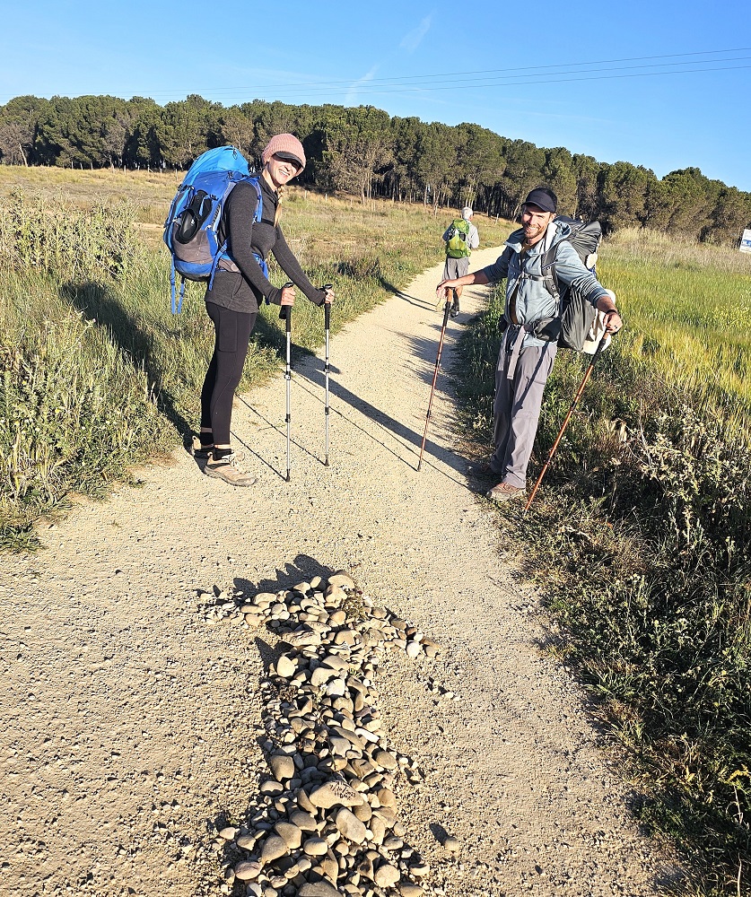 Gary: After Elizabeth got in the cab, the three of us continued the walk to Viana. We are walking with many familiar faces these days. We ran into the father/son combo from Taiwan. We met them the first day at Borda and have seen them almost every day. Soon after we walked with our Zimbabwe friend, who also stayed at Borda. He has really enjoyed talking with “the kids”. He gave Chelsea a beautiful copper bracelet from Zimbabwe. Very nice gesture. We continued on through the rolling hills with vineyards and various crops along the path on a beautiful day. On the way into town we ran into a South Korean woman who was confused as to where her Albergue was. I found it on my app and walked her to their front door. She was very appreciative. While I did that C and C found a sporting goods store.