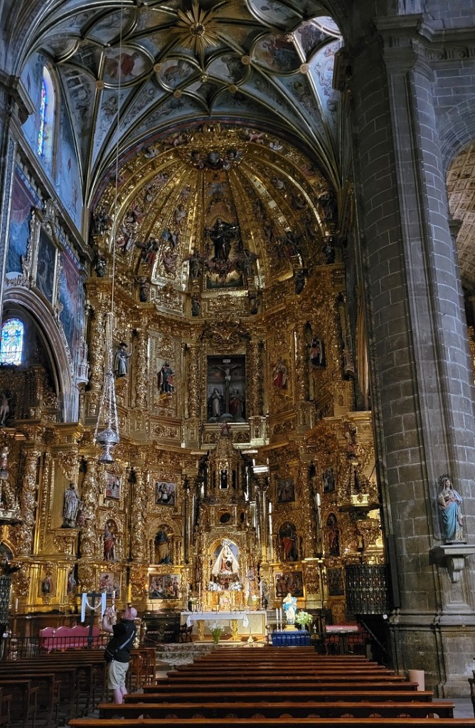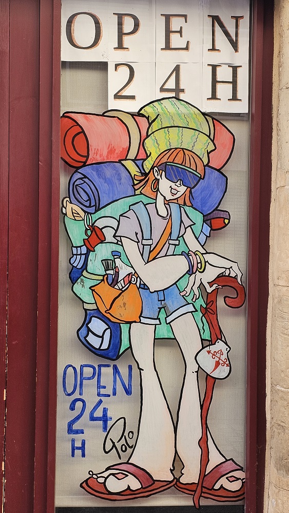 After a little rest break, Cooper, Chelsea and I walked back into town about 7PM. We found various markets for breakfast food, walked through the church, stopped for a beer where we spoke with a French blind gentleman (mid 30s) who was walking with a friend ( a woman mid 70s). He has a guide dog at home in Paris, but his friend has walked many Caminos and offered to guide him. We have seen them pretty much every day, but this was the first time we had a chance to talk. Fortunately he speaks good English. They were both an inspiration. They started 100 km before SJPdP and will stop walking in another week. Then will leave Paris during the summer Olympics and return to where they stop, to continue their journey to Santiago.