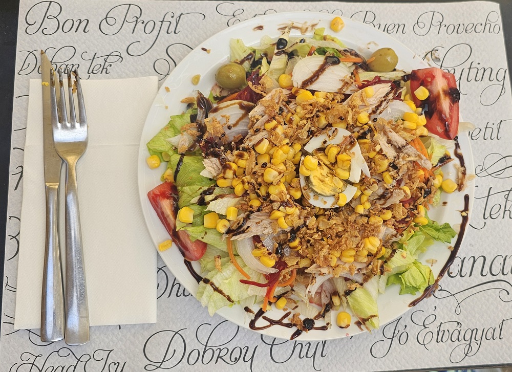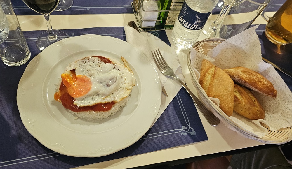 Cooper and Chelsea were at a cafe waiting for us as we walked into town. We had the Menu del Dia, (menu of the day). Common here. You choose a first course of a mixed salad, soup, potatoes salad, sometimes pasta and today they had what they called Cuban rice (white rice with tomato sauce and a fried egg on top). Cooper loved it! (see picture). The second course is often your choice of a beef, chicken, fish or a pasta dish and almost always includes fries…lots of potato, bread and wine here! The daily menu also includes the wine, water and dessert…today we chose Tiramisu! All for $18 per person!