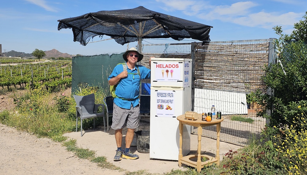We stopped in Najera to get off my feet and have a little picnic under a tree. We started hearing a swooshing sound of air through an irrigation line…we both jumped up, grabbed our packs, water bottles, shoes, food, etc. and ran a few feet just as the city park’s sprinklers began to shower the grass and trees we were under! Two local ladies laughed, with us, and told us the patch of grass near their cafe table would be “safe”. We managed to save our carrot cake, aqua con gas (seltzer water), grapes and cheese from getting soupy!