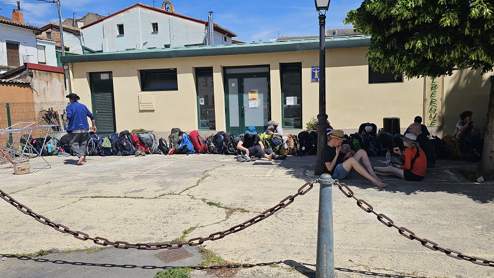 The kids were on their own today. They wanted to stay in the Azofra Municipal Albergue. It was first come first serve and they walked without us so they could arrive faster and get their choice of beds. Success, two beds, not bunks, and in a room that has a door! Rare. Usually the big Albergues have bunks (this one has 60 beds – good sized) and whoever arrives first gets the better bed locations. But this place has 30 rooms and two twin beds (basic) per ” cubby”. No bunks. The outdoor space has a cold water foot bath….ahhh. We stayed there in 2015.