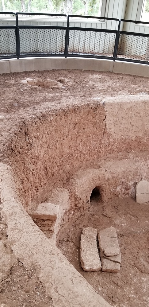 We stopped to view the many ancient (1150 -1300) cliff dwellings which can be seen some 20-miles south from the Visitor’s Center. (see pictures below). We experienced our first ever view of the dwellings that were used 550-750AD called Pit Houses. They were the homes of the ancient Pueblo People before the Cliff Dwellers. Pit Houses are large dugouts in the ground, roofed with thatching. According to archeologists, they were equipped with fire pits, food prep and storage areas and air vents which were wholes in the bottom of the pits leading to a tunnel up to the ground level outside the roof area. (see photo below).