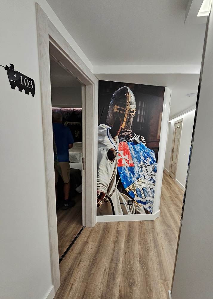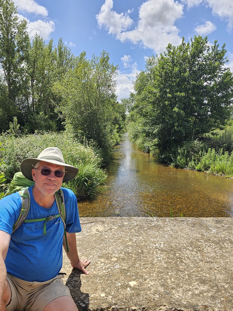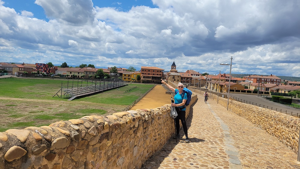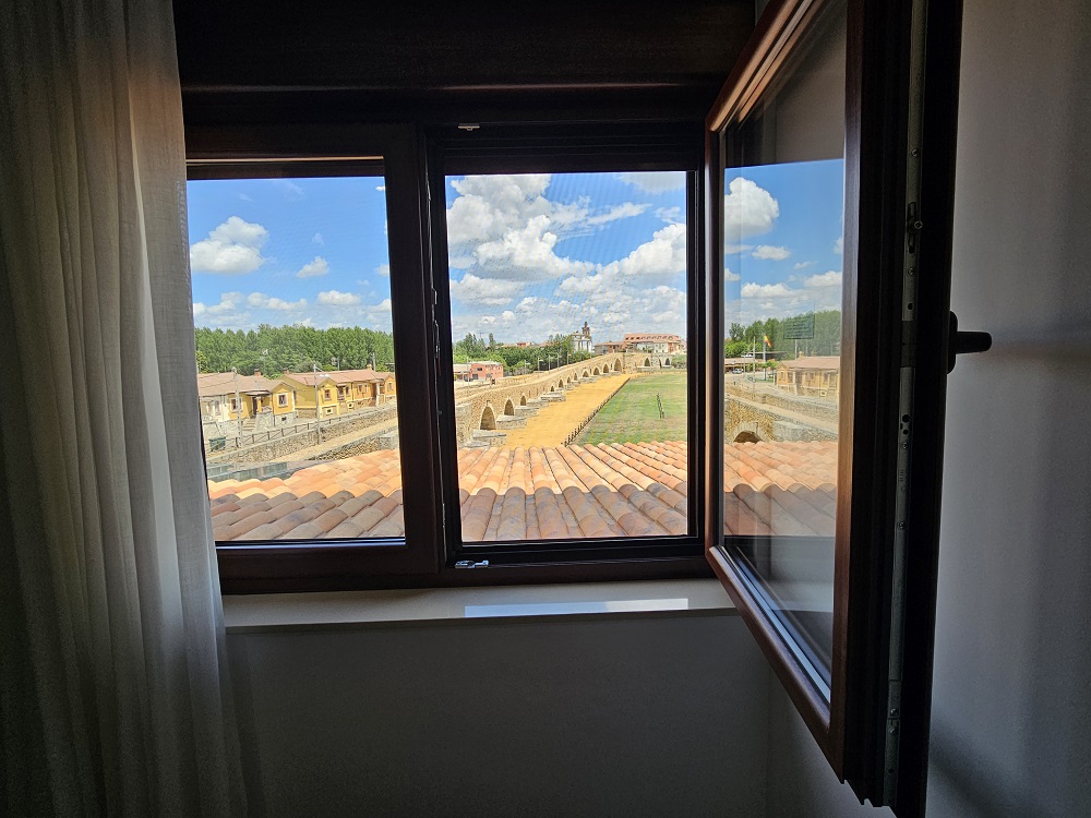 Although Gary and I agreed we thought this walk, and unfortunate lack of services on the route we chose, made for probably the worst or most unpleasant day so far, we ended the day well. We enjoyed a light lunch at mile 12, got water, saw some cool ponds and rivers during the last 3 miles, the trail turned dirt rather than 12-15 inch path along a black top road and we love the hotel we chose in Hospital de Orbiga (population about 900). You enter the town on a medieval bridge with the annual set up for a Renaissance Fair set up beside the bridge. Our room overlooks the bridge and was an easy walk to a café a block away where we enjoyed a really nice 6pm meal. We sat amongst locals and chatted with the 38 year old Spanish restaurant owner who lived in Boston and Chicago so conversation in English was easy.