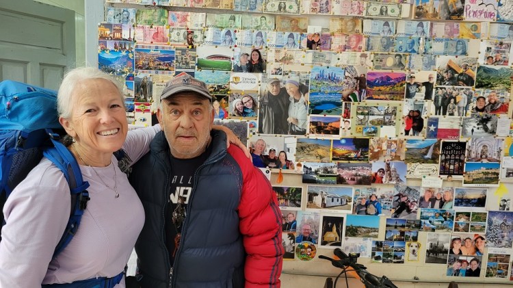 We were glad to know that he was still there and Gary gave him the postcard. We made a donation and he gave us some orange juice and fabulous stories. Even though we did not speak each other’s language, the gestures and his sharing special items in a Hope chest of his own travels, as well as showing us all of the additional photos and postcards he has been mailed from other pilgrims around the world, made the reunion one we will never forget. I asked him about the dog and was worried about the answer but he smiled and I believe he said that the dog he would come around when he is hungry.