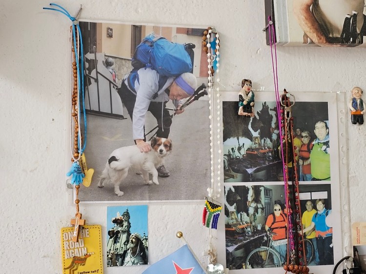 The back story on this gentleman is 4 years ago we met him at his wonderful donativo (donation) shop. I had stopped to play with a dog just outside his place. We saw that he had fruit and cookies along with many pictures and flags from different nations. He could not speak English and our Spanish is extremely limited but that conversation was wonderful. He showed us around and explained where everything came from, including all the monetary bills from many different countries. He indicated that he wanted to give us his address so that we could send him a shirt or hat with Arizona on it. After we finished our Camino and had returned home, Gary packed up in Arizona Cardinal’s T-shirt and I made photo copies of pictures that we had taken with him. We never knew, four years ago, if he had received them or not. Before leaving home this year, Gary bought a Grand Canyon postcard and has been carrying it for the entire trip so far. When we saw Senor Perez, I noticed a picture of myself and the dog up on the wall.. I pointed to the photo and senior Perez says, “Arizona, si!”. He remembered us.