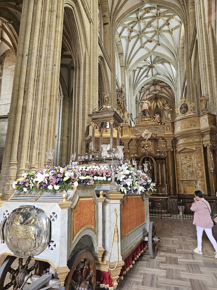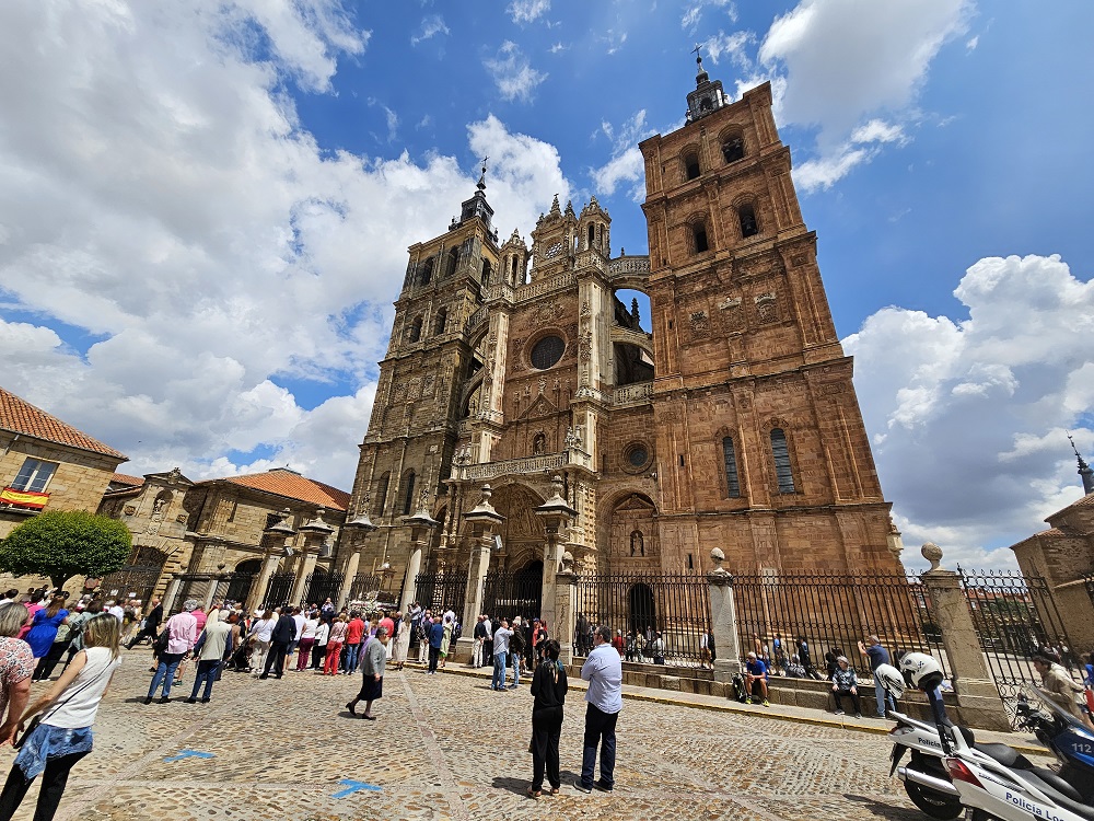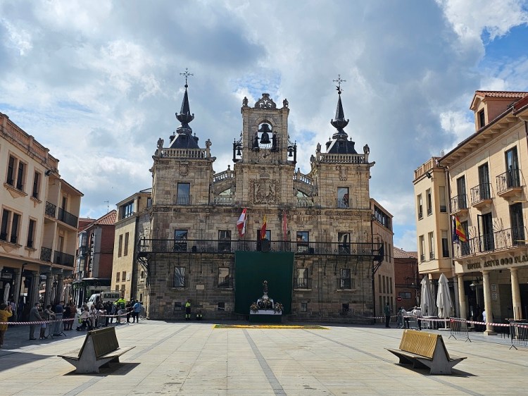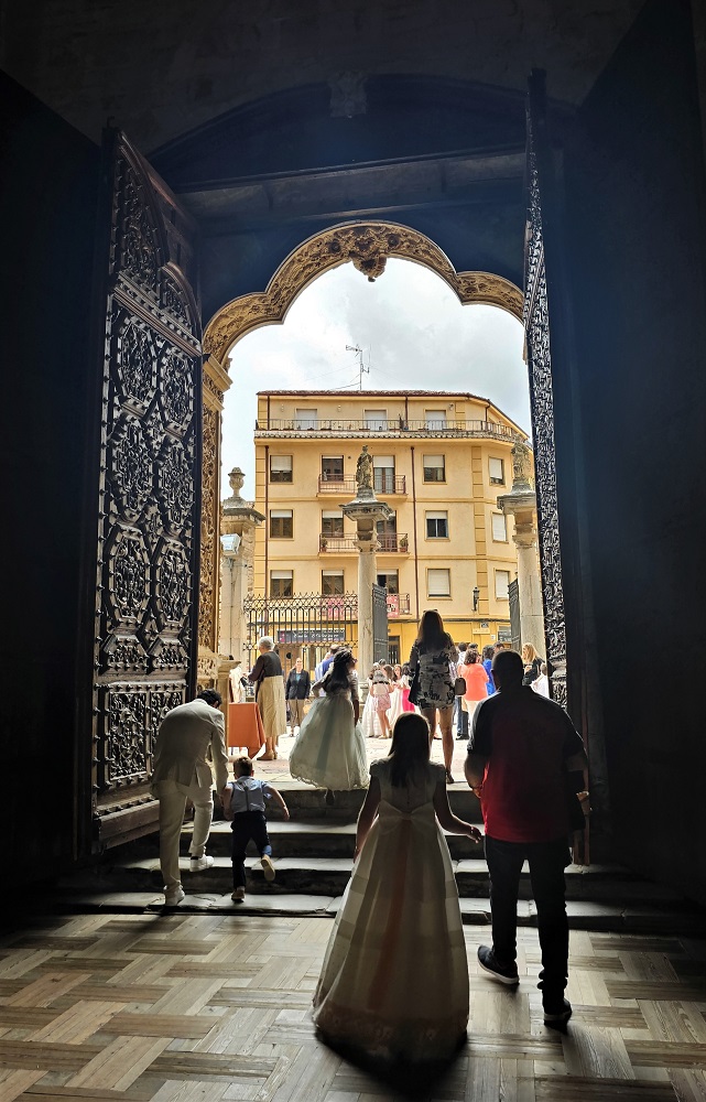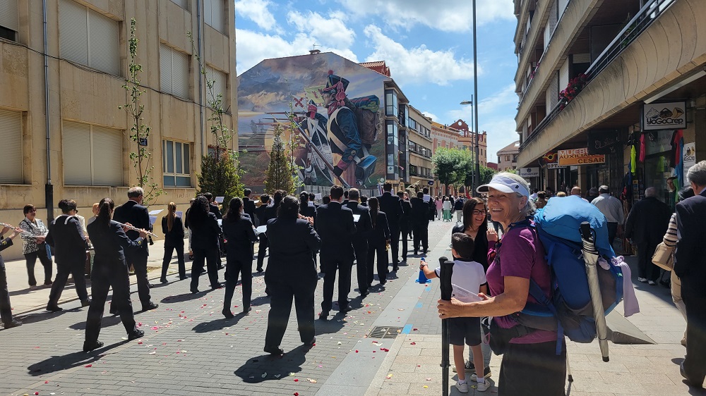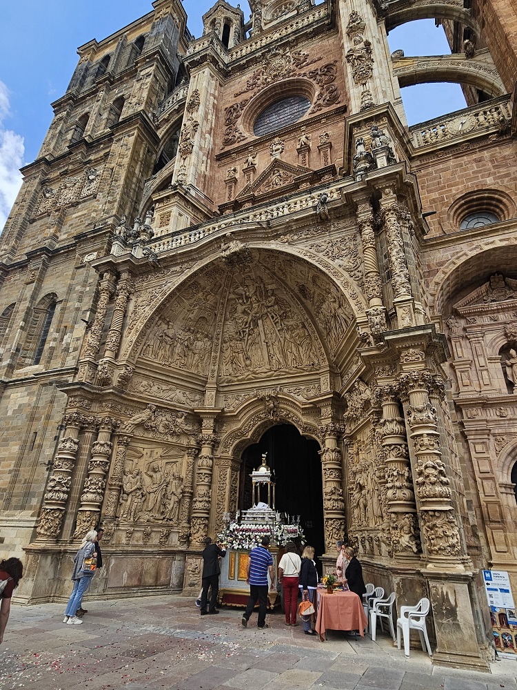 We were following the Camino into Astorga and noticed there was an entire plaza roped off. As we continued walking, I heard music playing, so we veered off the Camino by one block and there it was a procession of marching bands, children in very traditional church attire and priests fully garbed heading to the plaza where we just were. We were told it was celebrating The Feast of Corpus Christi.