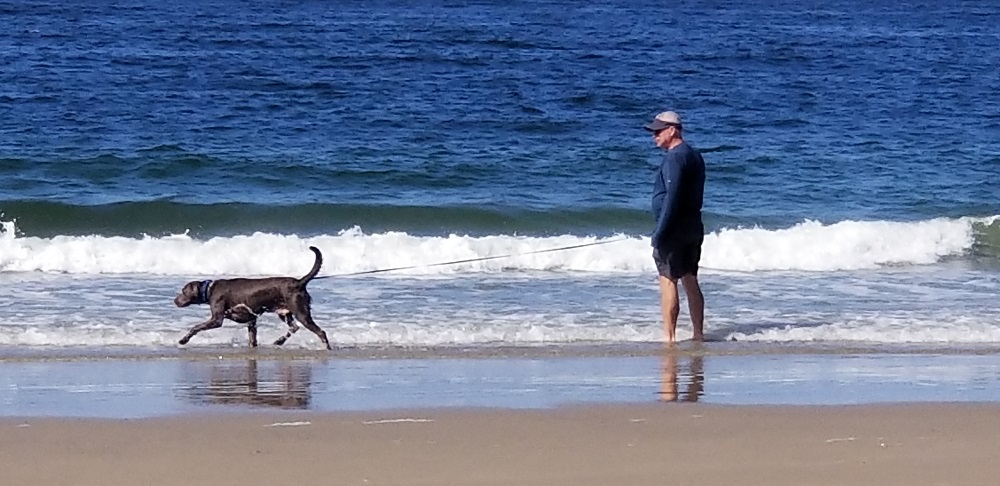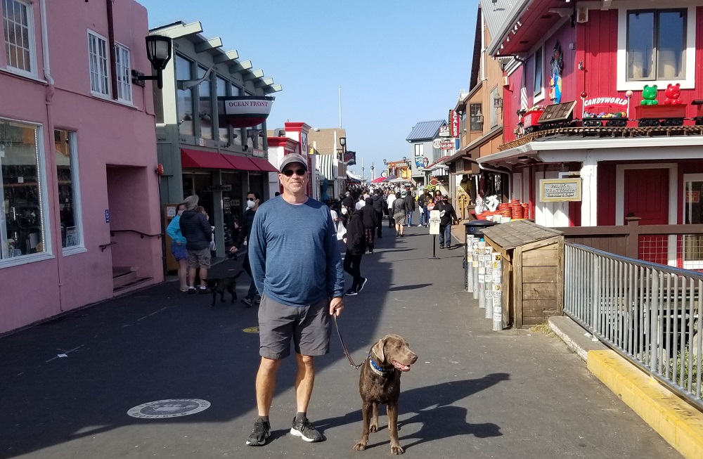 We then exited the park via 25 north towards our stop for the night in Monterey. After checking into our hotel, we walked to Fisherman’s Warf, a bit over a mile away. Rangeley felt tortured as we walked along a path paralleling a stream teeming with geese, mallards and coots! But we soon arrived at the beach which allowed dogs on leashes and let him swim in the ocean waves. Gary has a difficult time holding on to the retractable leash but it’s perfect to tire the pup out before a nice sit down meal.
