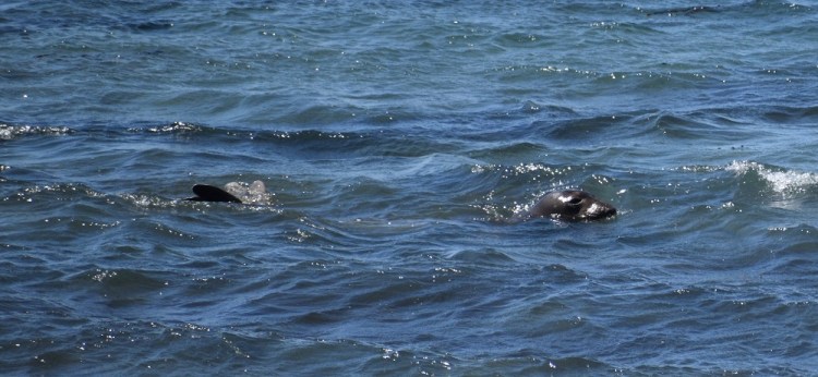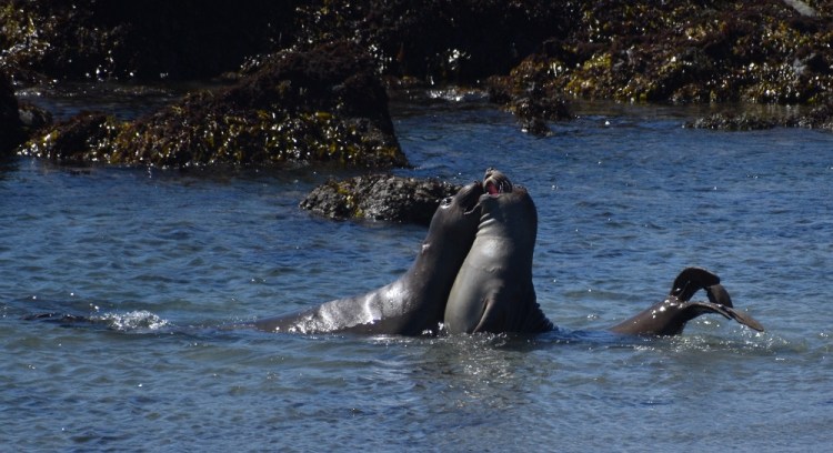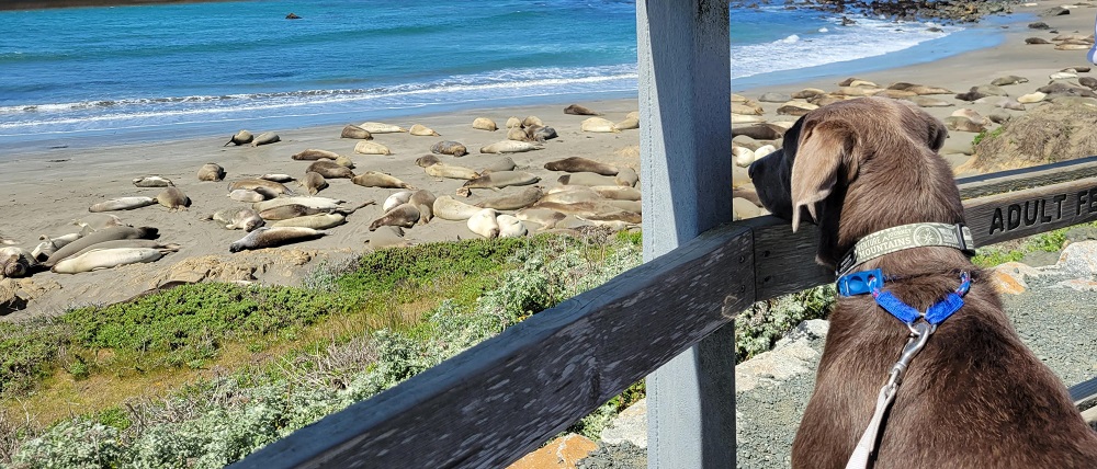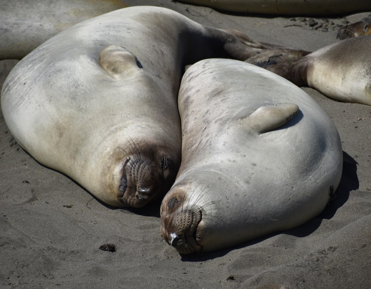After the above impromptu stop, we were off to view another amazing creature, the Elephant Seal. Thousands of them come to the shores in the spring just north of San Simeon. I so enjoyed watching them dance in the ocean, cuddle on the shores and bathe in the sand. Rangeley was a bit perplexed by the large animals with no legs.